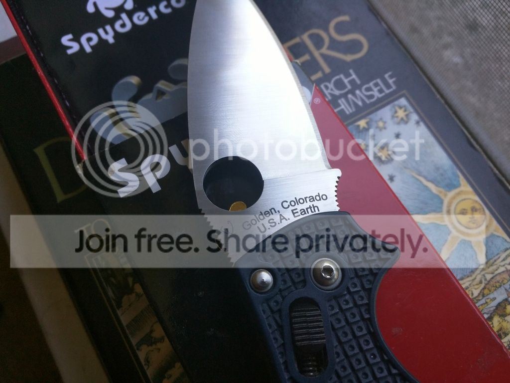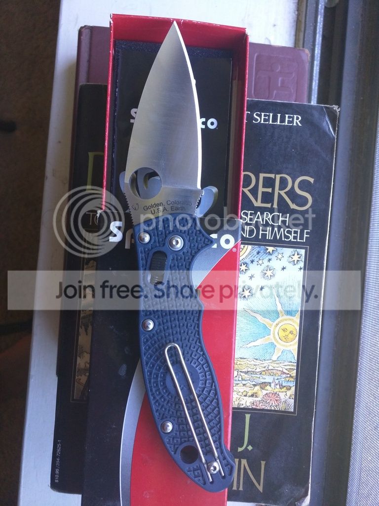 Up for sale is my lightweight Spyderco Manix in S110v for $83 shipped. This has a navy blue FRN or FRCP handle. There's a tiny chip in the blade a couple mm from the tip, otherwise condition is excellent. \There are one or two hairline scratches in the side of the blade. The only photo I have available is a closeup showing the chip, pretty small. Lockup and action are perfect, slightly off center left when clsoed. Box is included.