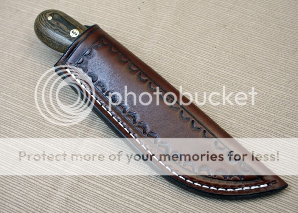The sheath is 7-8oz hand tooled leather from Wickett and Craig. It holds the knife securely and allows for a smooth draw.