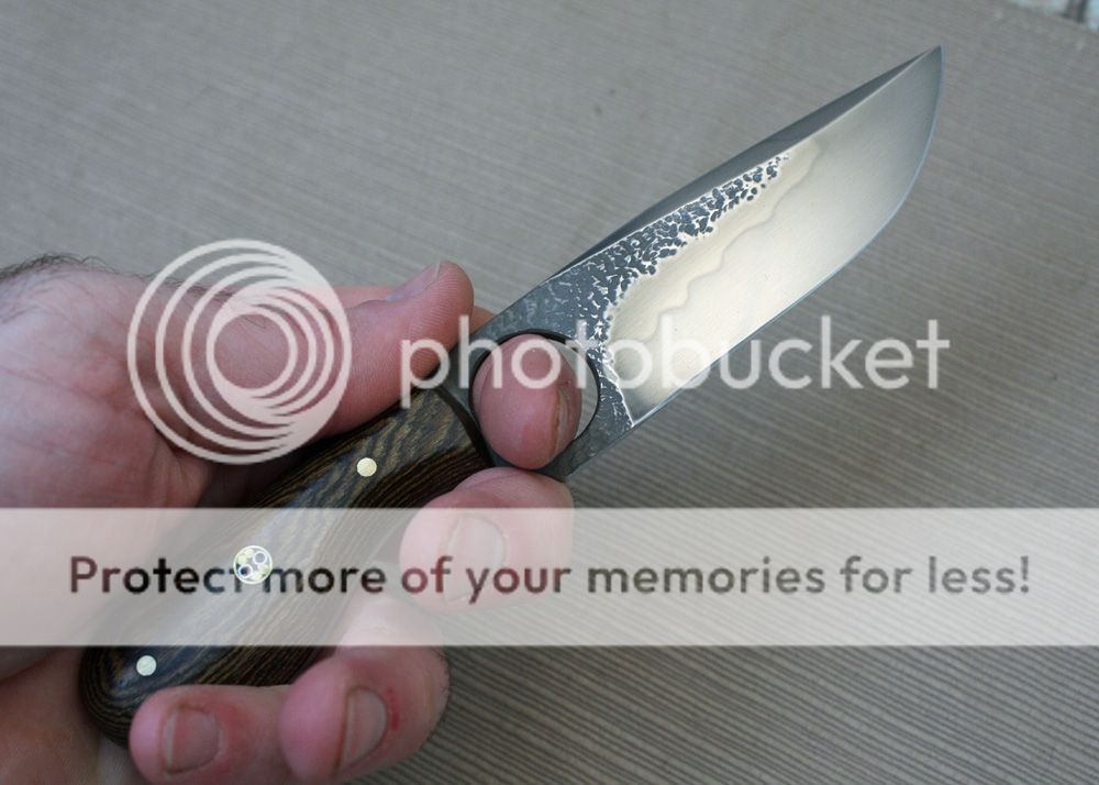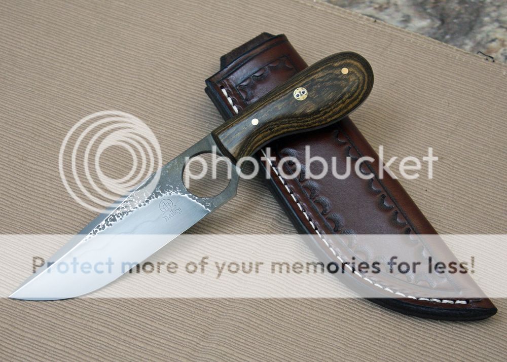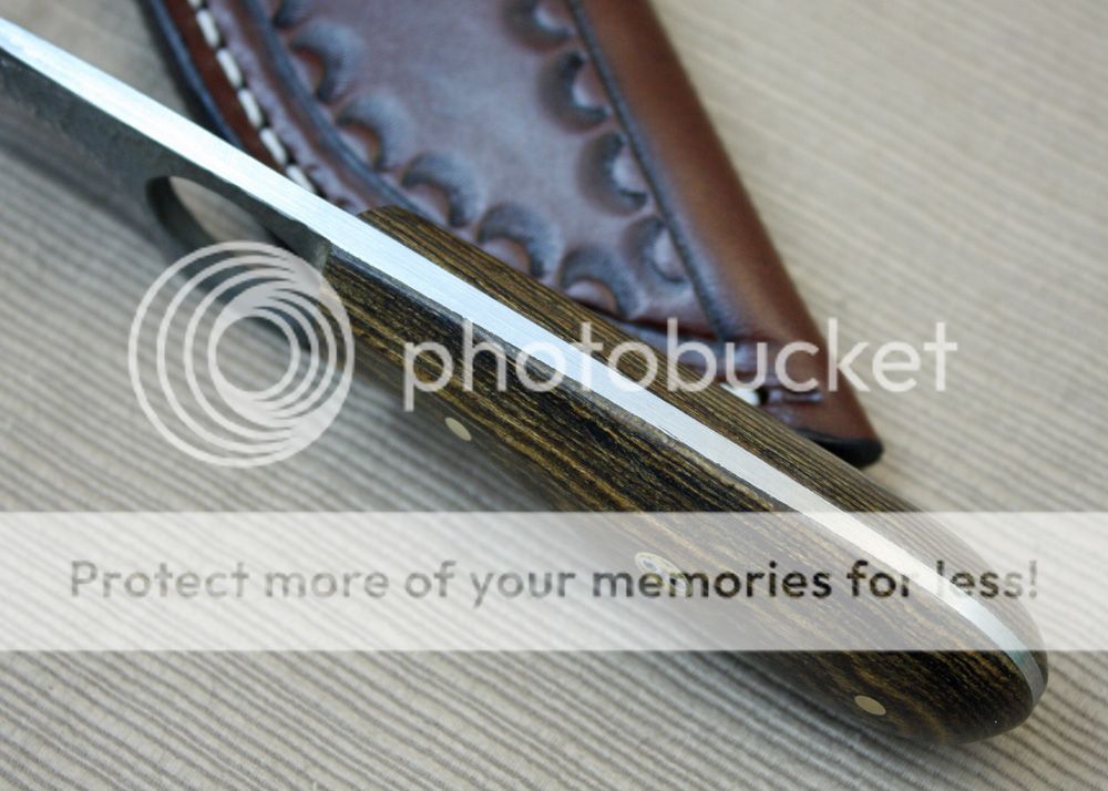 The handle is bocote. It has a nice swell that tucks into the palm of the hand when gripped through the ring hole. It is really comfortable and it provides a very secure grip. It is held in place with pins and G-flex epoxy.