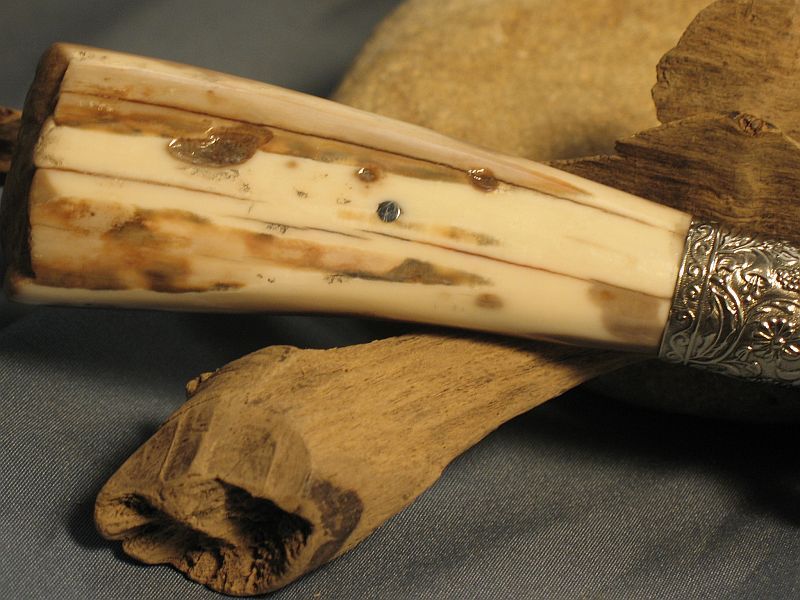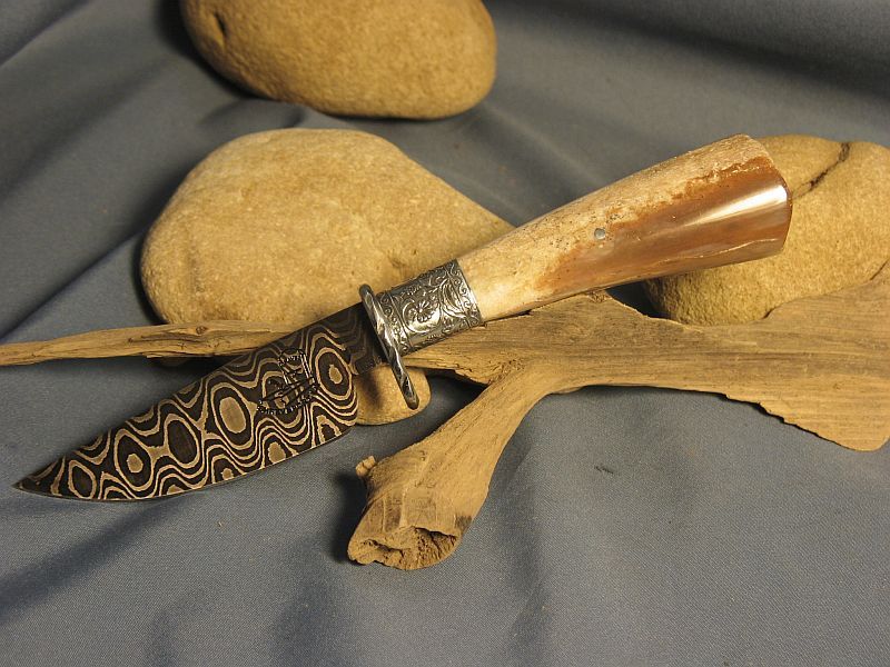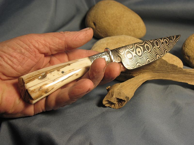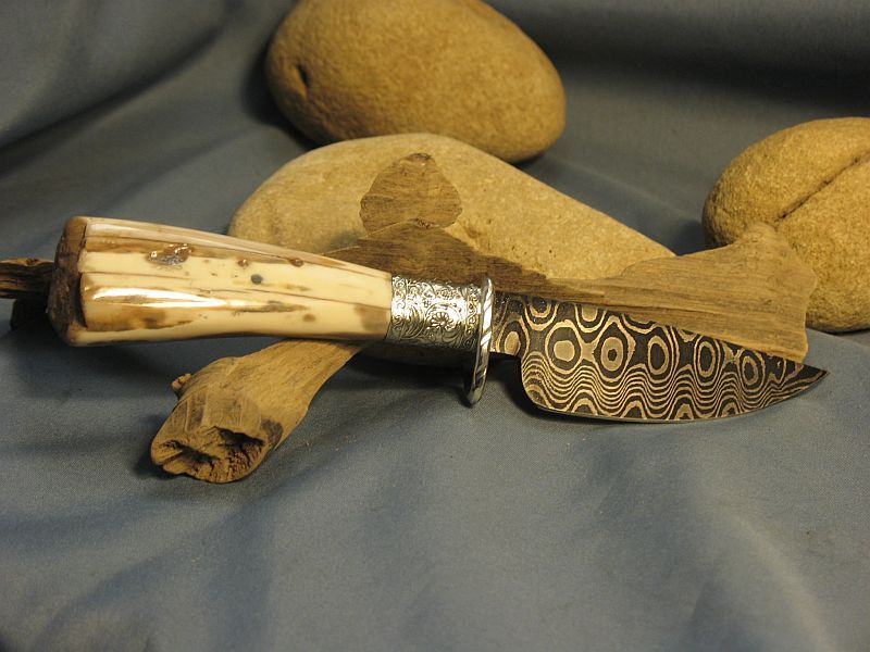 Hello folks. I make a lot like this but this one is a "LIL GEM" of one. This one has a blade that is 3 5/8 inches and overall is 7 3/4 inches. Damascus I made with 1084 and 15n20. The blade is a 1/4 inch thick at the guard and tapers to point. Nickel silver guard and sterling ferrule. Very comfortable in the hand. The handle is fossil walrus ivory with end as it came out of the ground. and the sheath is included. Hope you like it as I enjoyed making it. It is "SOLD" plus 8.00 for priority mail. My paypal is dangraves4923@earthlink.net
