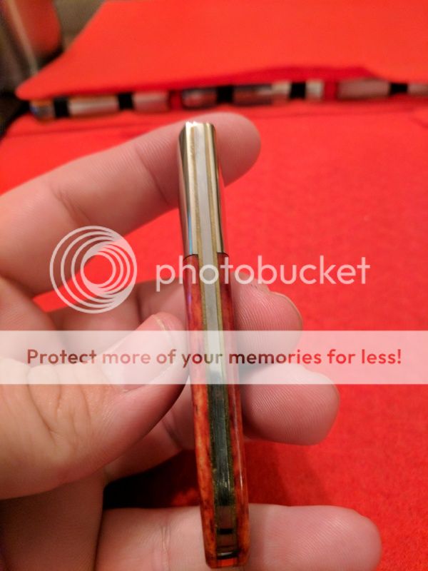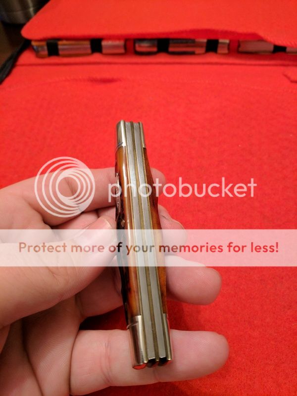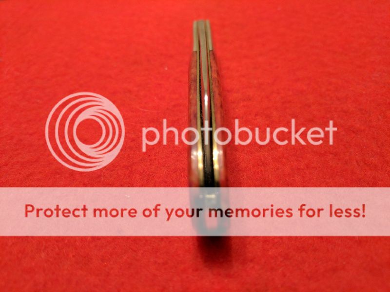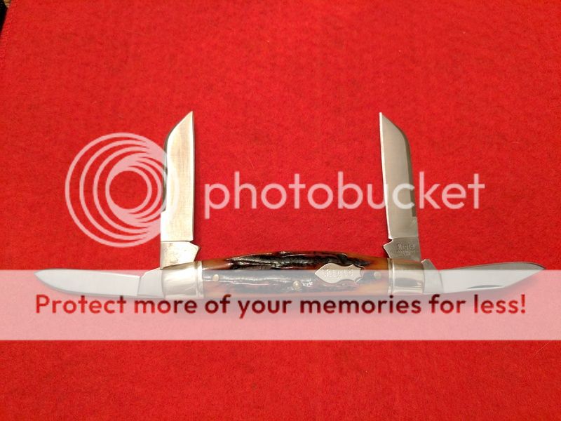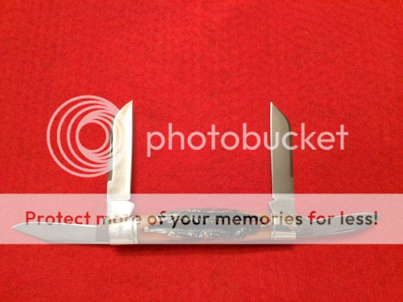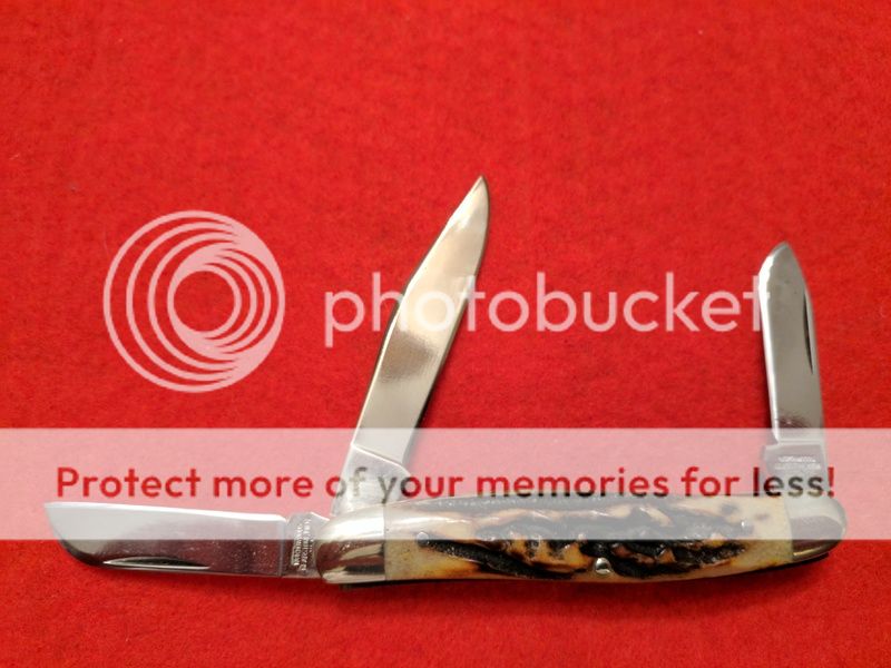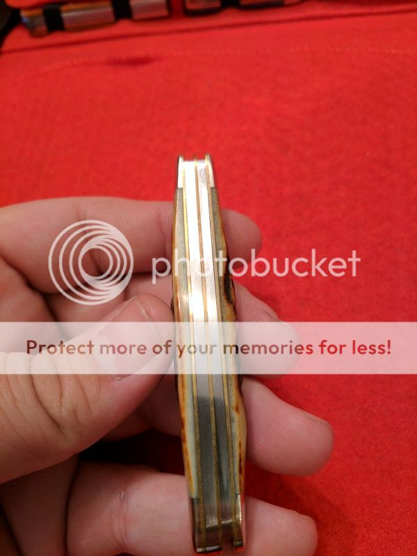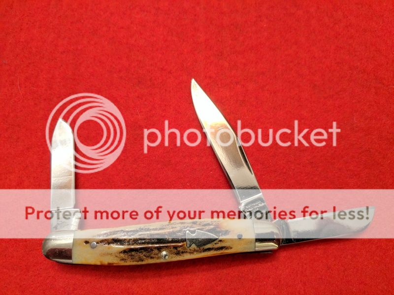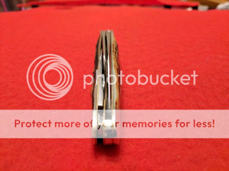Northwoods small stockman. About 3.5", nicely figured stag handles, made by Queen in D2 steel. I bought this from Gary Graley who put one hell of an edge on it, sharpest piece of Queen D2 I've ever owned. He lowered the sheepsfoot ever so slightly to make it ride very unobtrusively. Nice walk and talk, nice pulls, sheepsfoot is a bit tougher than the other blades. I don't have the box. $130 shipped.