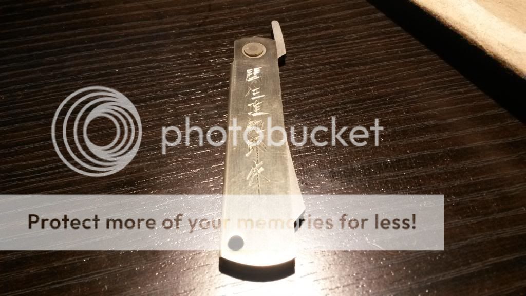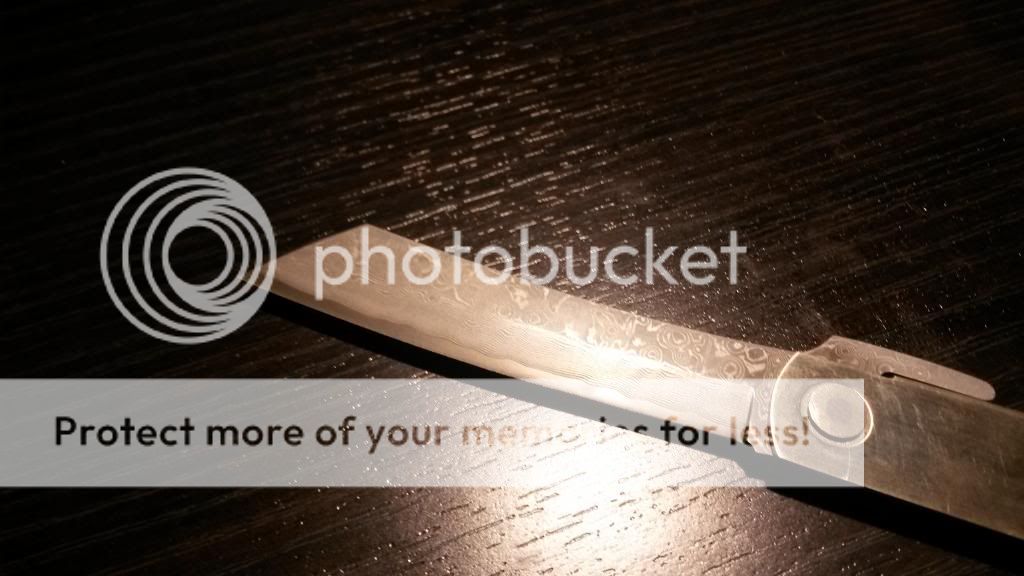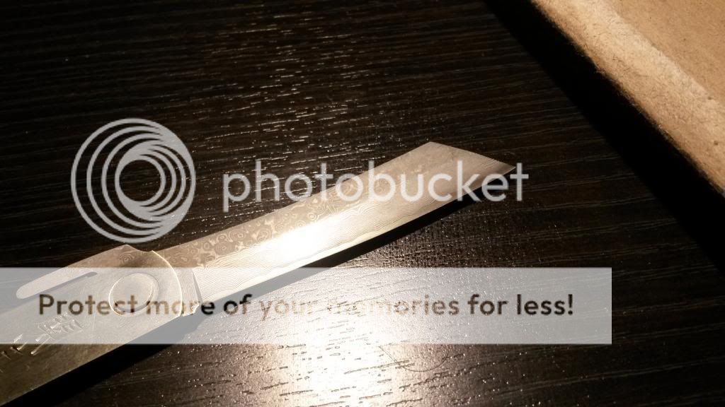 Up for sale is my Hattori friction folder with damascus steel blade. The blade is a little over 3 inches long. Opening and closing is smooth as butter. This knife is the sharpest knife in my collection by far. It came this way when i bought it from a fellow memeber. I am pretty sure the edge is factory. I am asking $125 for the blade and trust me that is a steal. See pics below: