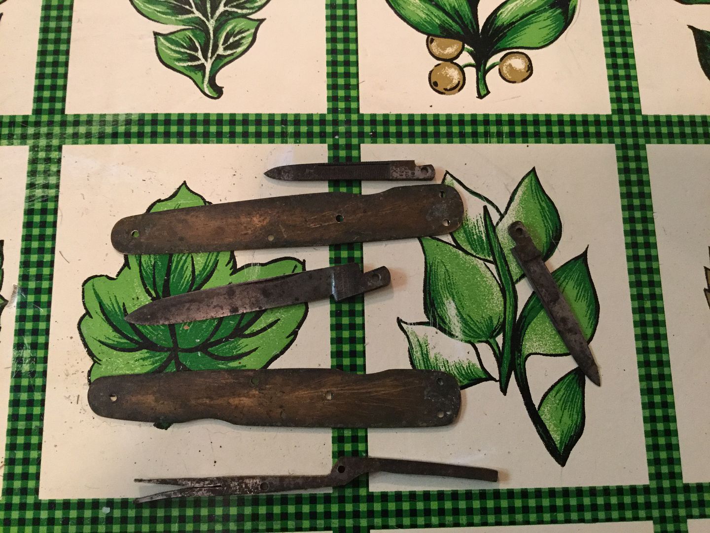I forgot to take a picture of the parts cleaned up, but I went with just rust and grime removal with a wire brush and left the patina intact on the blades and spring. I sanded the liners to 1200 grit but didn't go below the majority edge because I didn't want to make them any thinner.