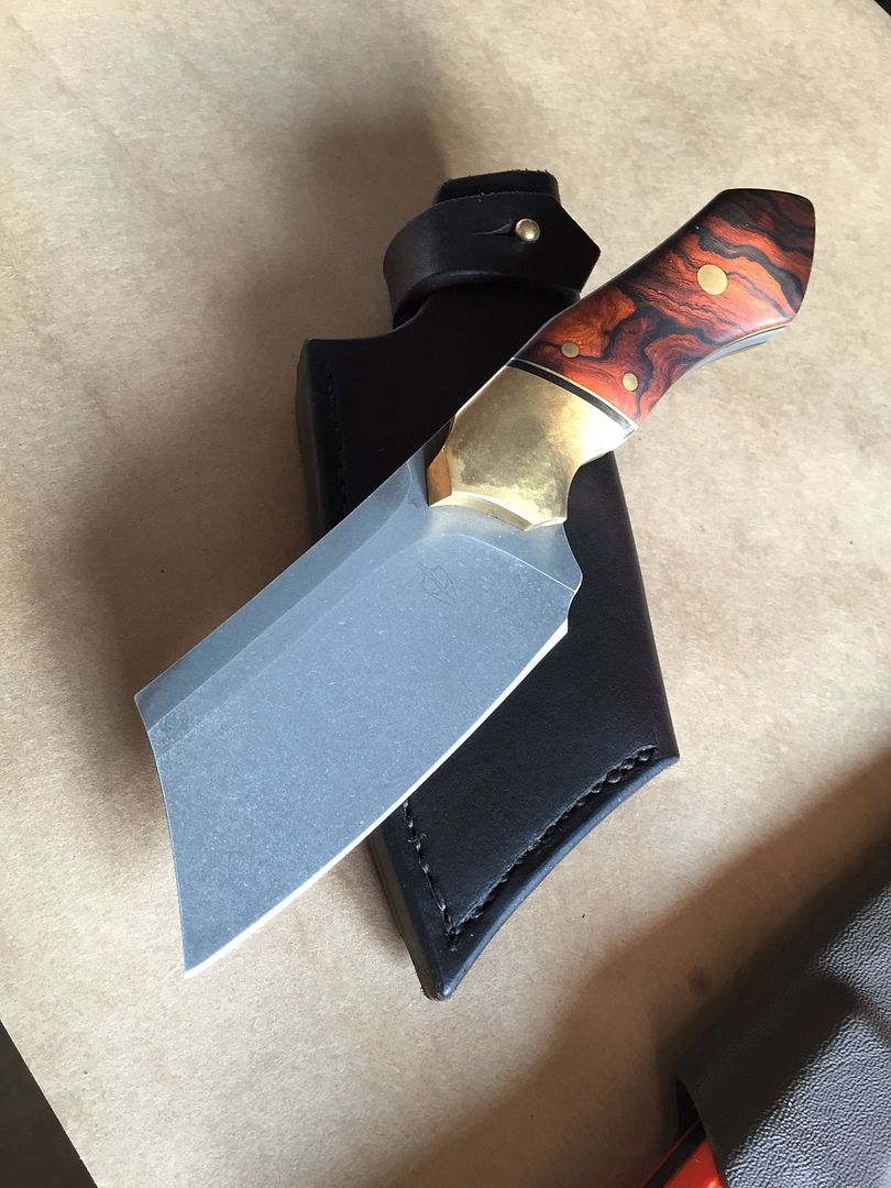 A cleaver in N690 by Landon of Lodato Knives, with leather sheath, as new.