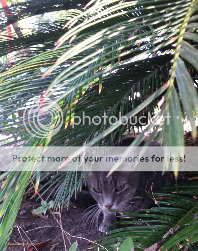 Here is my cat Echo, in one of her favorite spots: under the leaves of a sago palm plant in my yard. She will nap in its shade on a warm day, and enjoy its cover as a hunting blind, convinced one day a squirrel will stroll by.