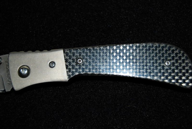 Damascus and ti bolsters and liners w/ Carbon Fiber overlays. This knife feels great and it comes w/ papers and Box