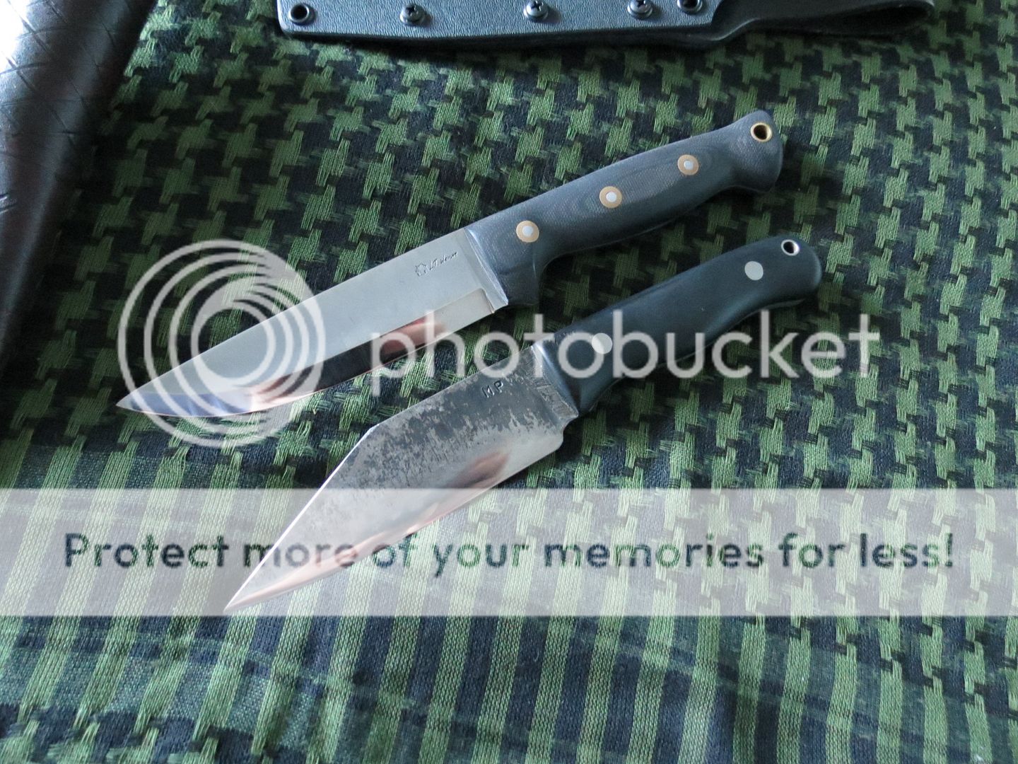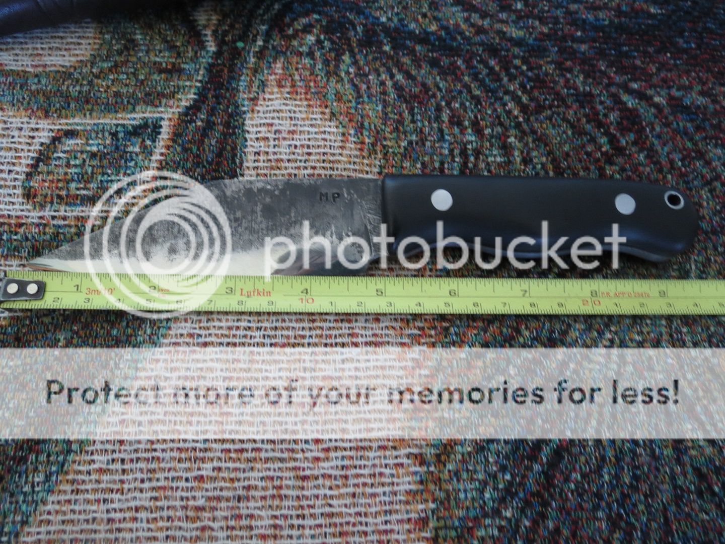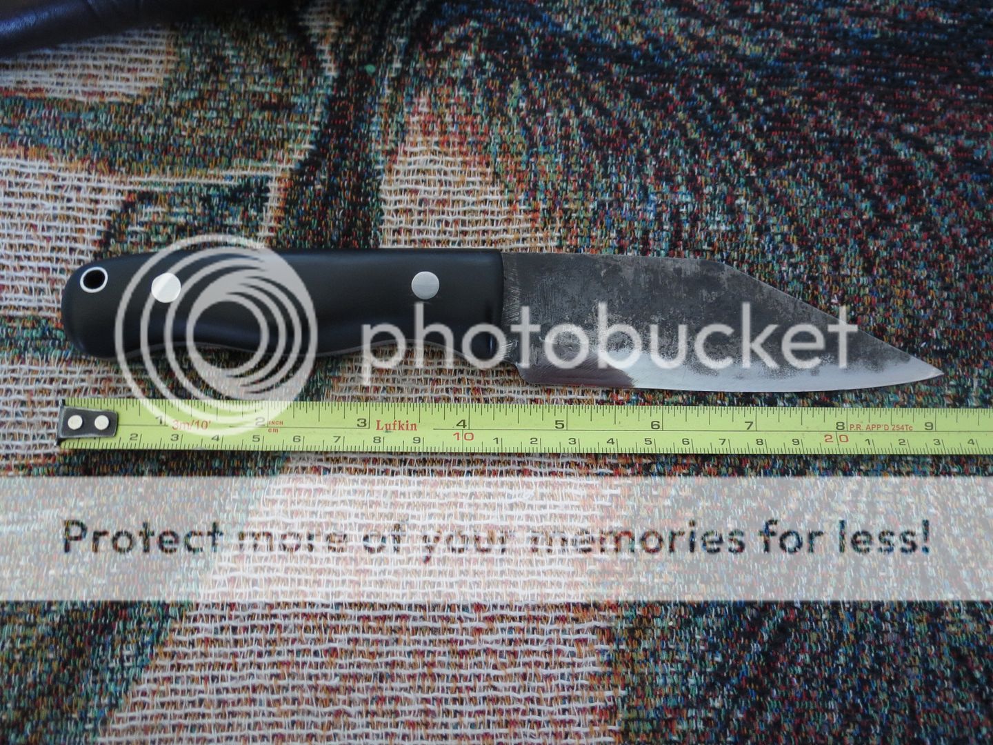 Next up is a MP (Matt Paul) Drifter Seax - Used, like new. I forget what steel this is (5160?), but it holds a great edge and is easy to sharpen. Flat ground to a convex edge. Black paper micarta, stainless pins with a leather sheath (not my best work, but it protects you from the blade and vise versa). $300.00 USD shipped.
