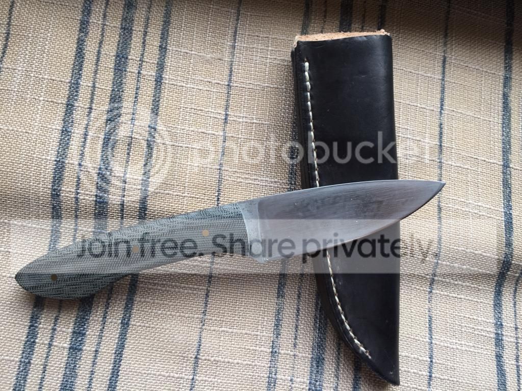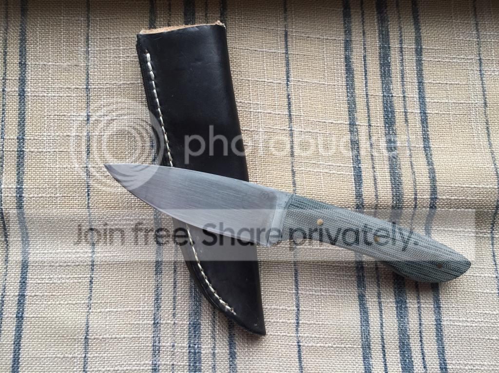 Wanting to sell this little guy I picked up from Mike himself. Made from 1095, blade length about 3.5 inches flat ground with slight convex edge, and handles from blasted black micarta. Comes with black hand stitched leather sheath with belt loop. Spine ground flat at 90 degrees and it throws a good spark from Fire steel. It came with a forced patina which I didn't care for so I tried stripping it and I must admit I did a pretty terrible job. Needs a little buffing and will shine back up.
