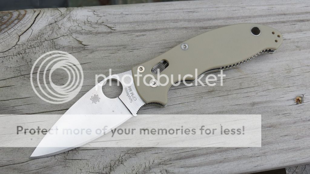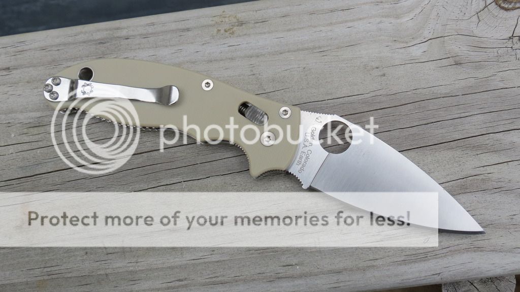 Spyderco Manix M4 with tan G-10 scales. Excellent condition. Comes in original box but without white paper. Carried and used a few times. A few spots on the blade but nothing major. I believe the edge is original. A few swipes on a Sharpmaker, and this will be a killer cutting machine. Very smooth action. (The blade has a few water drops on it in the pics because it was snowing outside, but they have been wiped off.) $OLD