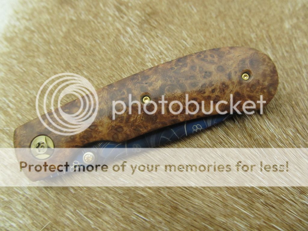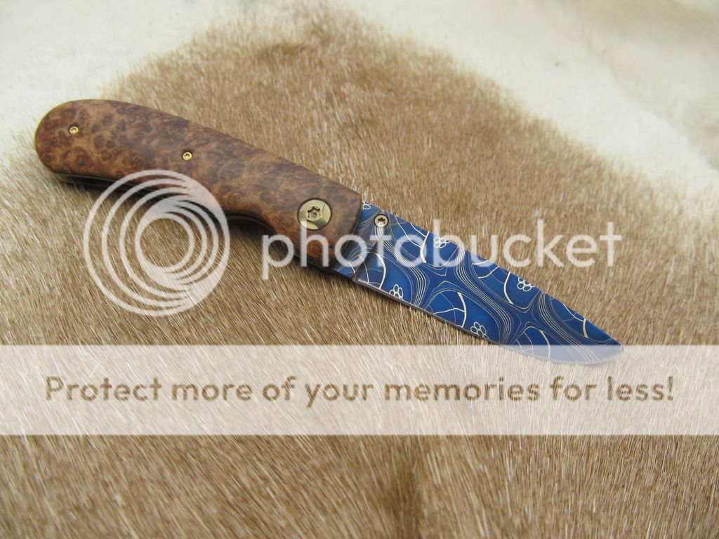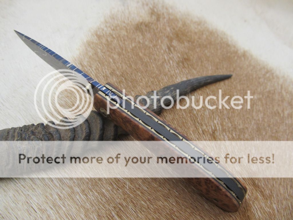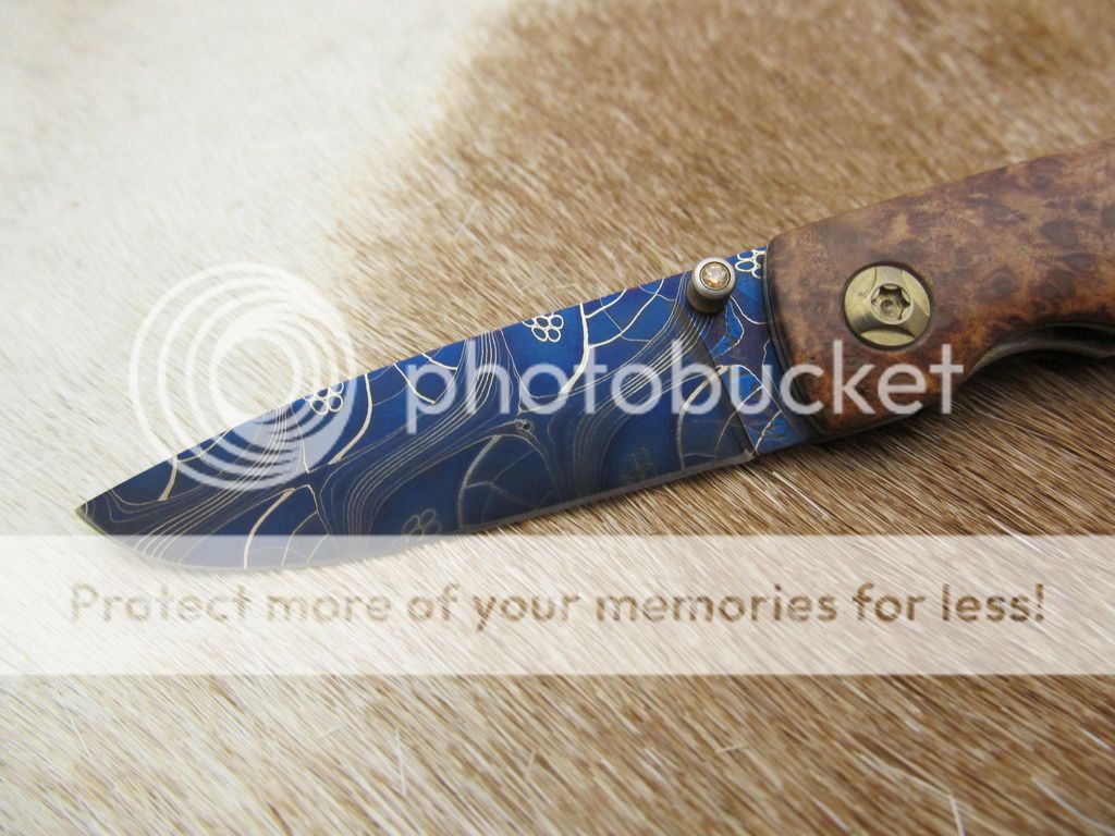 There is a needle point size flaw in the Damascus, the last photo shows it. It is on one side and is only cosmetic. The pin hole does not affect the strength or performance of the blade at all. The price is discounted because of it.