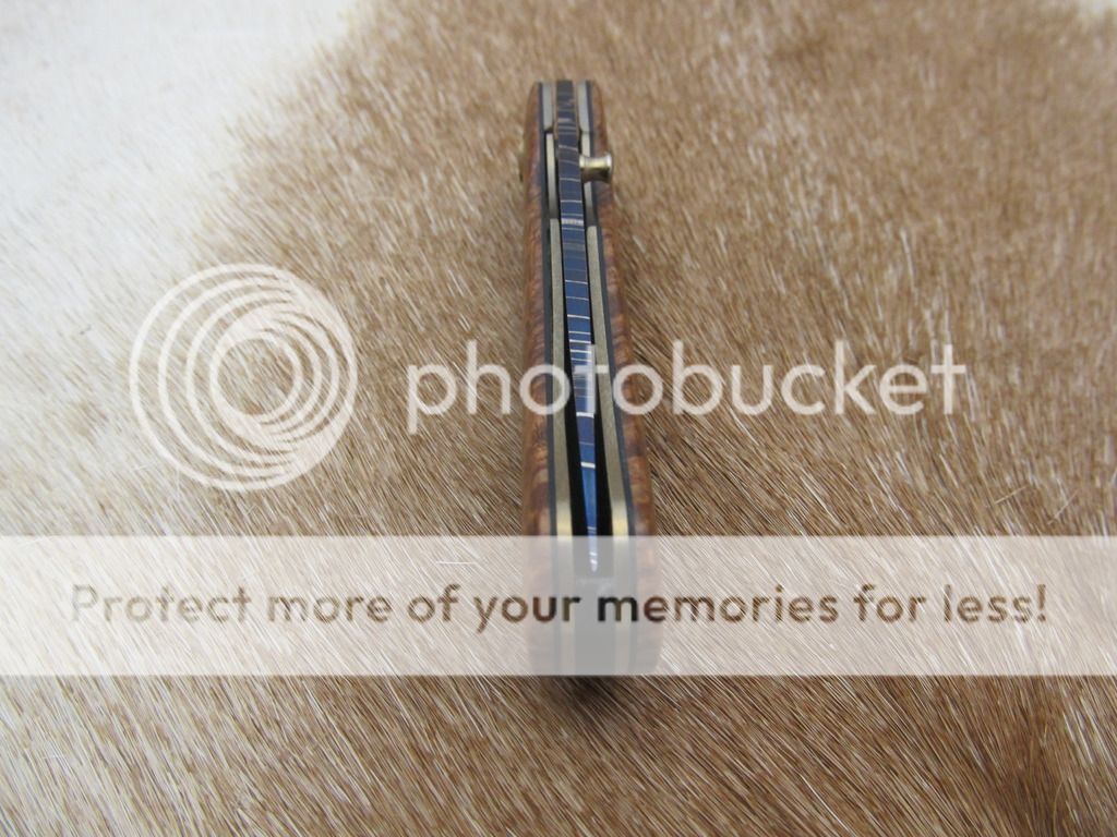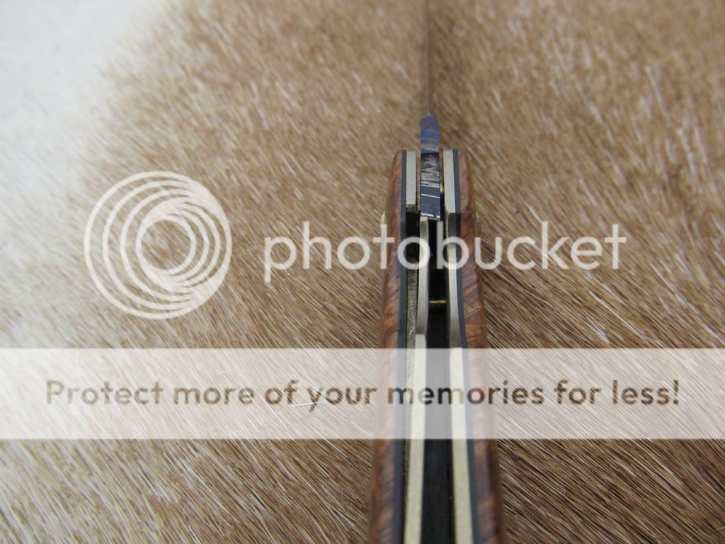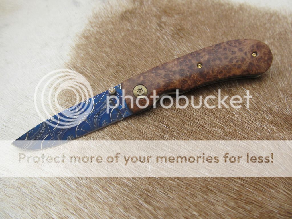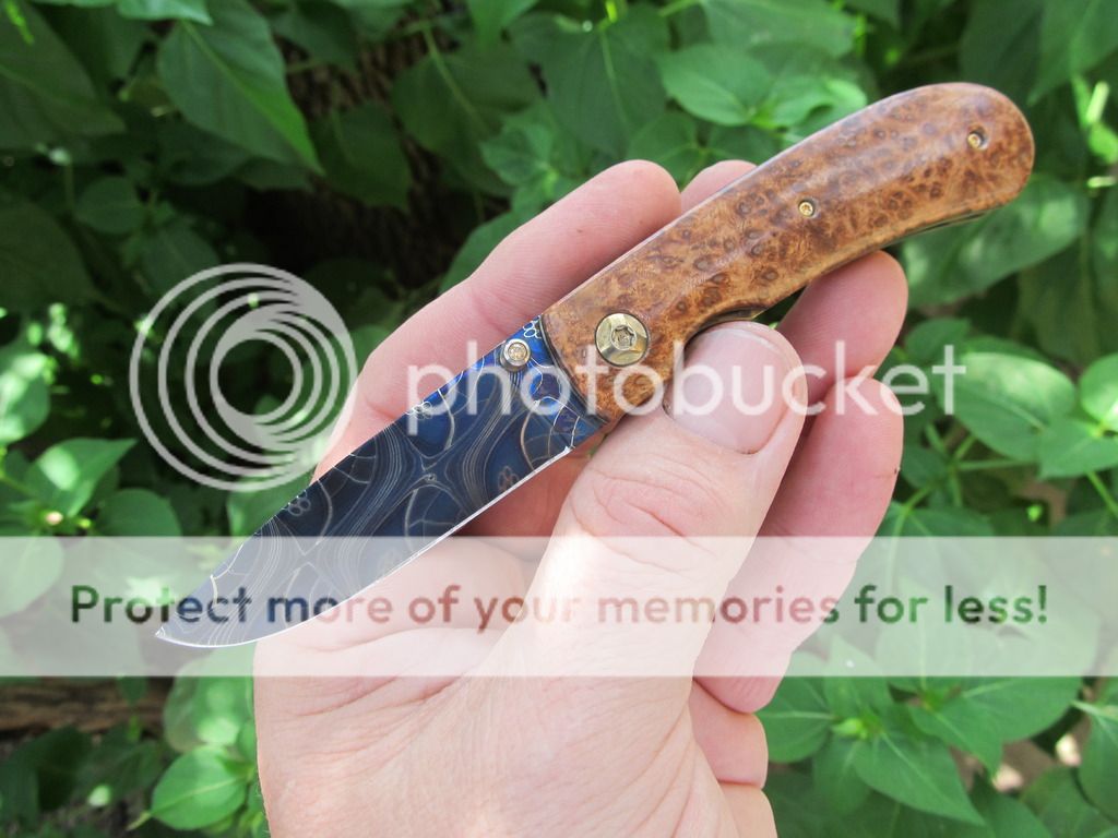 There is a needle point size flaw in the Damascus, the last photo shows it. It is on one side and is only cosmetic. The pin hole does not affect the strength or performance of the blade at all. The price is discounted because of it.