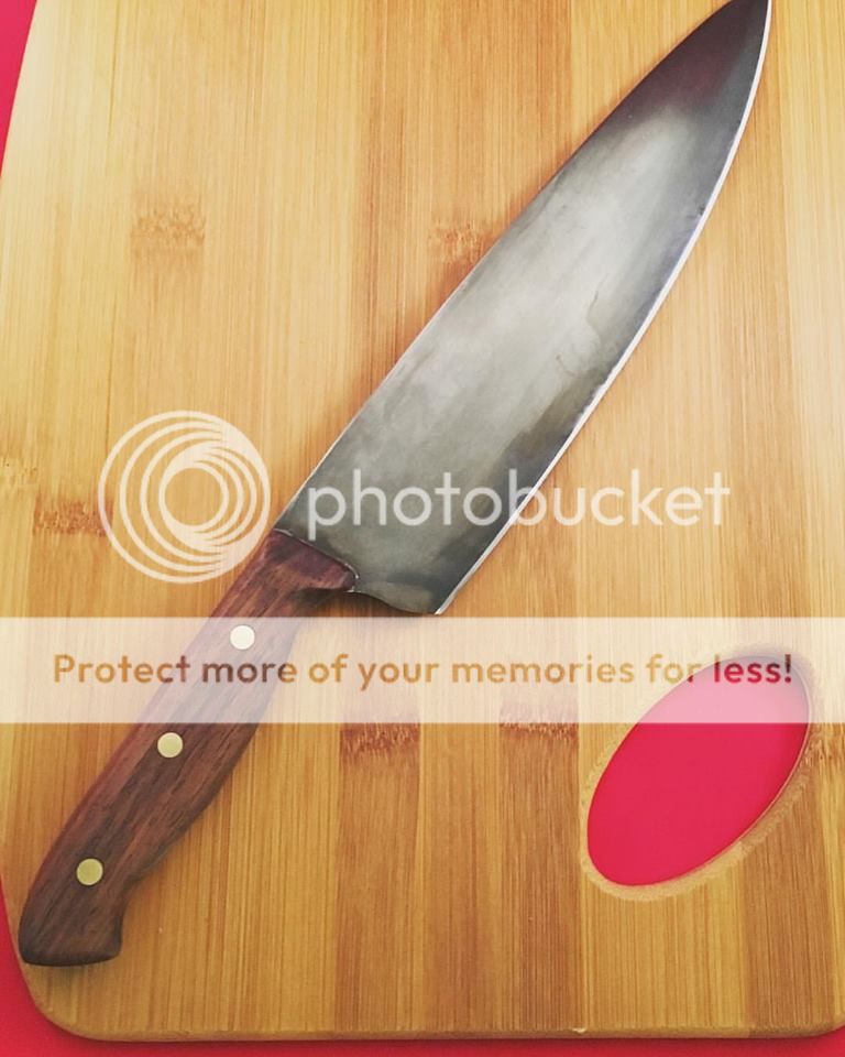 The handle is purple heart, poplar burl and african blackwood. Steel is the Suminagshi cladding with white #2. The blade profile was also a first. It has little belly like a Gyuto but the spine drops down way further back on the blade than normal on a japanese blade.