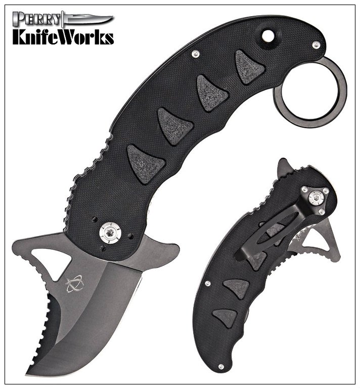 - Snaggletooth 2 - 5-5/8" closed linerlock. 2-3/8" black oxide coated M-vX stainless standard edge modified drop point blade with thumb hole pull, extended tang and extra jimping on top edge of blade. Black G-10 handles with "shark tooth" indentions. Pommel of handle features an automatic push button release oversized ring pommel for a Karambit conversion. Reversiable black stainless pocket clip. Designed by Morgan Thomas.