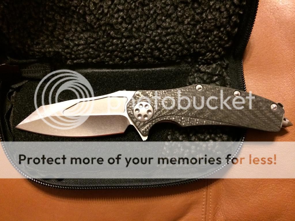 2. Marfione Custom Arbiter. (serial number 002) New in box. (Box is signed by Tony from 2013 Blade show) Hand ground stonewashed blade and has custom leather sheath w/CF inlay. Knife has 30k layer CF handles w/Blue Ti screws. The back side is sharp also about halfway down. Truly an awesome blade. $XXXX shipped. SOLD AND SHIPPED