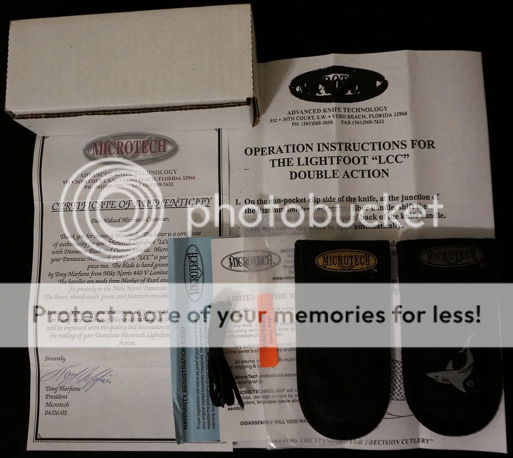 Included are all original packaging shown in pic below (Certificate of Authenticity, box, pouch + extra Lightfoot logo pouch, plastic sleeve, lanyard, warranty card, registration card, and operation instructions with lanyard knot tying instructions on back).