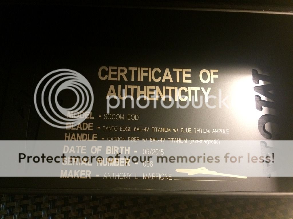 2. Marfione Socom EOD. New in box, only opened for pics. Sweet blade. Has tritium ampule inserted into blade spine. Torched blade, back spacer, lock bar, pivot, and screws. Awesome knife. $withdrawn