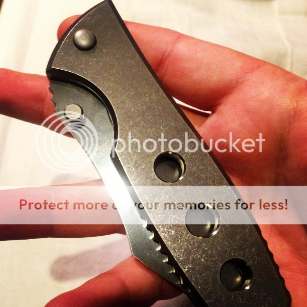Handle: full titanium THICK Framelock, very thick, with hole pattern. dark anodised, bead blasted and stonewashed.