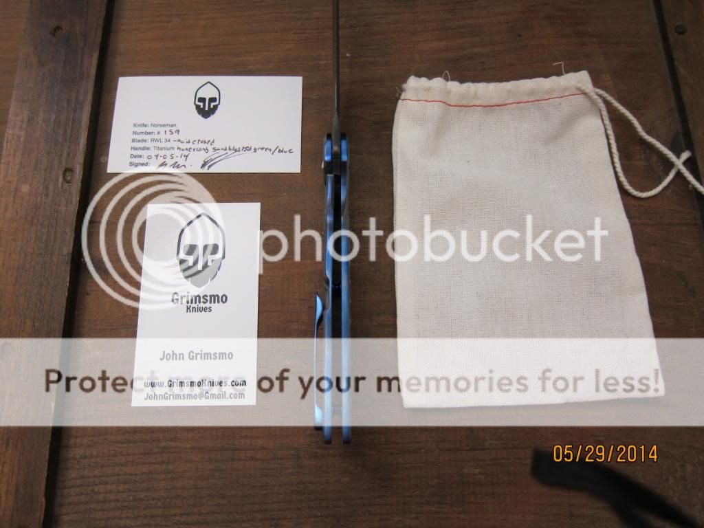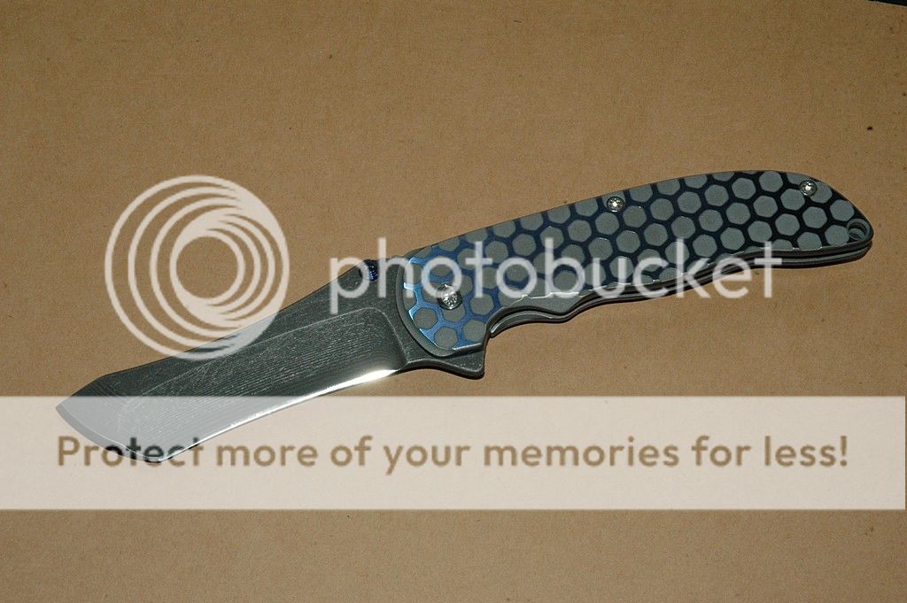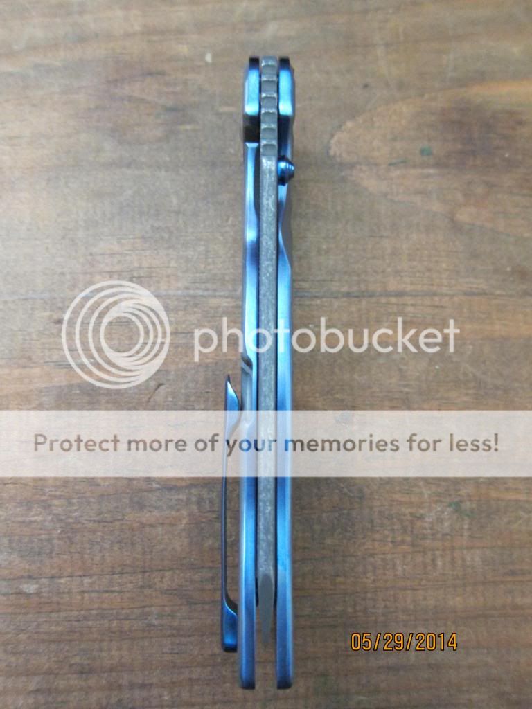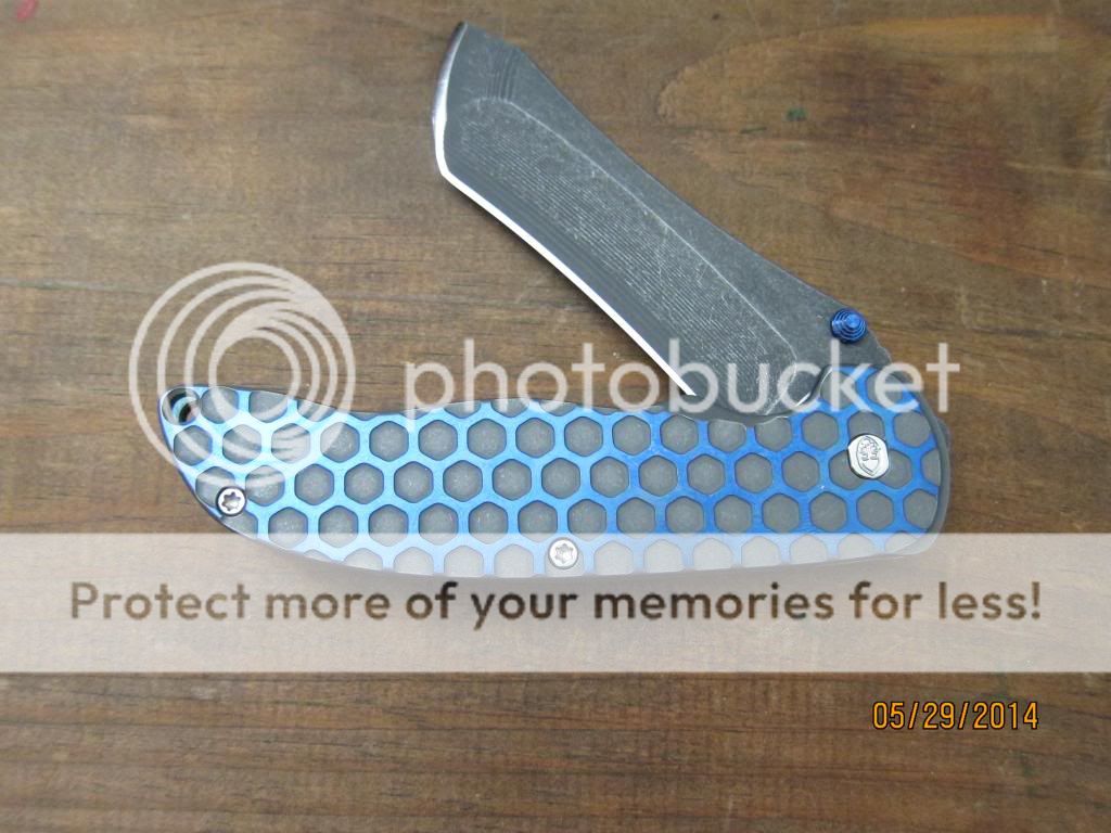 Like new, never used or carried just flipped. This is from the recent run with upgraded ceramic bearings. This is without a doubt the smoothest flipping knife I have had or tried. Acid Stone wash blade, and sanded and anodized flats on this one too, which was all extra coin. The base coat on the Ti scales are a gray/green with blue honeycomb. Drill marks that are inside the "honey comb" were removed for smooth finish. Lock side has a slight stone wash and no imperfection in color. Awesome combo! Blue sides, clip, and thumstud. Flips like a dream, falls shut, sharp, and ready for a new owner. Fit and finish is better than customs that cost twice as much. Asking $570