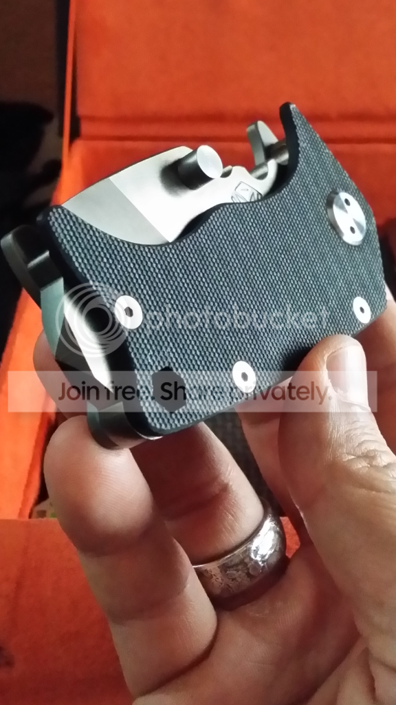 I am the second owner. This was originally a green cerakote but sent it in to Medford to have it replaced with the black G10. It's fresh back, been sitting in the knife box ever since. It was also sharpened by Greg during it's visit. There are a few very light snail trails on the flamed Ti side. Very hard to see and capture in pics. Other than that, this knife is in top condition. Lock up is solid, blade perfectly centered. This is an extremely tough knife.