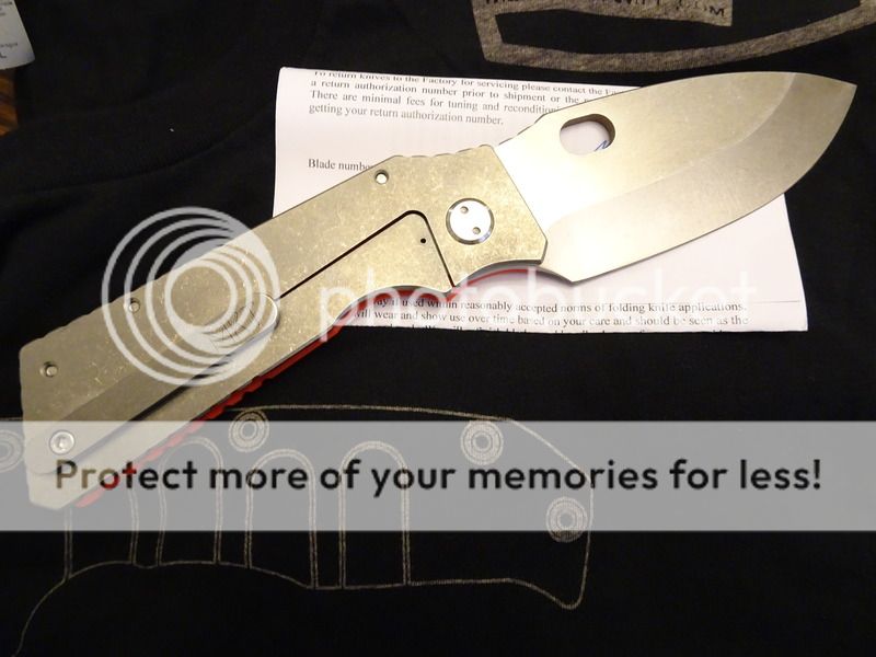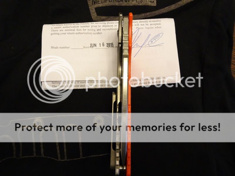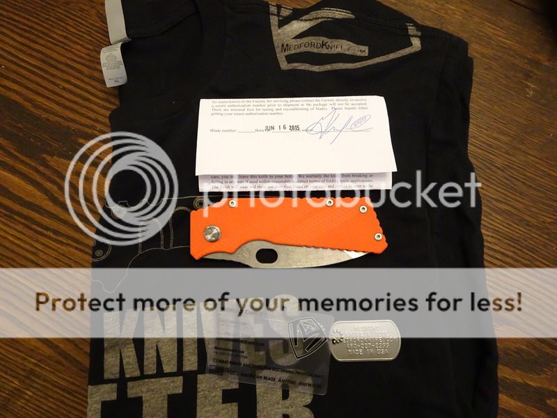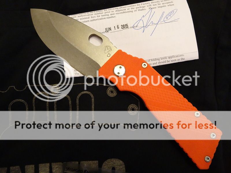 Up for sale, no trades, a Medford TFF-1 in elegant titanium and safety orange. I am the second owner on this one, still factory sharp, looks brand new, no box or case. I am throwing in a "Black Knives Matter t-shirt, XL", that has the Medford logo on the shoulder. It has the born on date paper, dogtag, card. It looks like there is a dirt smudge nearest the first scale screw, G10 side. Perfectly centered. Asking $325.00 Paypal, all fees included in the price. Shipped signature required.