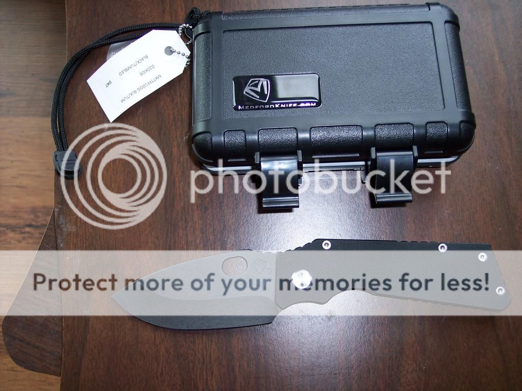 This is a Medford TFF1, Black oxide D2 blade with black G10 scale. Has opened a few packages. There is a light scratch in the G10 near the butt that the camera doesn't show and a pinprick mark in the coating on the underside of the blade near the lockup. Otherwise like new. Includes hard case, cardboard box, and papers from Medford. $SOLD shipped and insured CONUS Only Please.