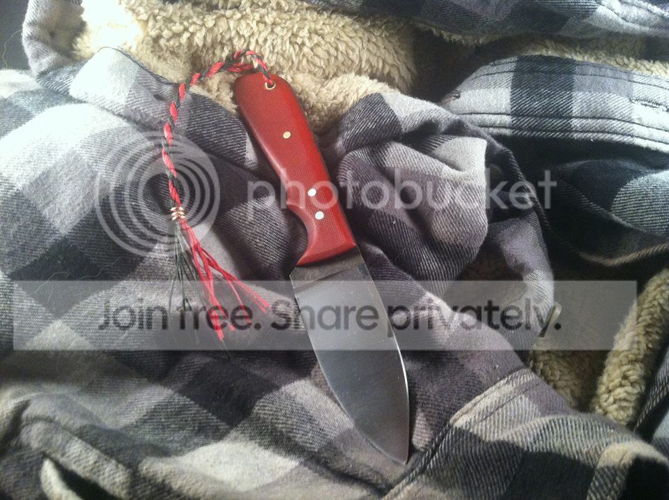 Blade: High flat ground, distal taper, 3.4" long and 3/16" thick at the ricasso. Hand rubbed to 1000 grit. Forge scale flats.