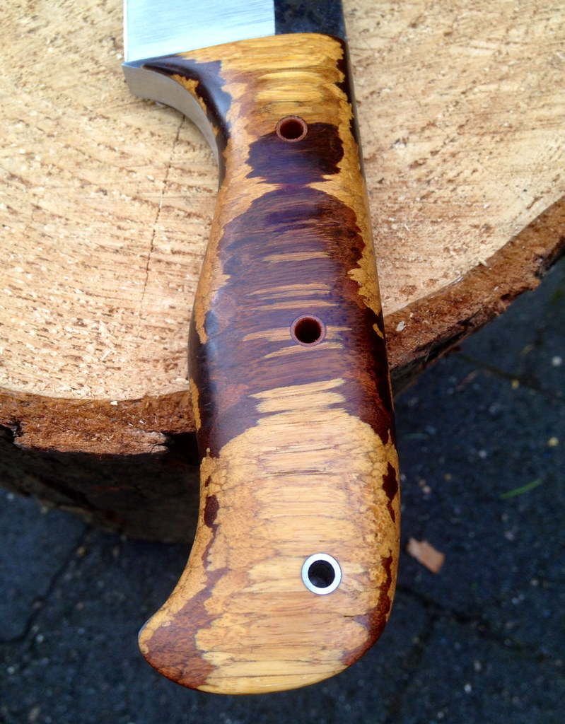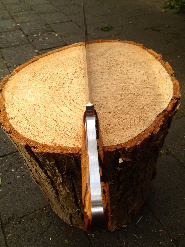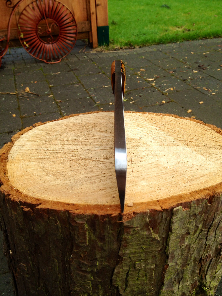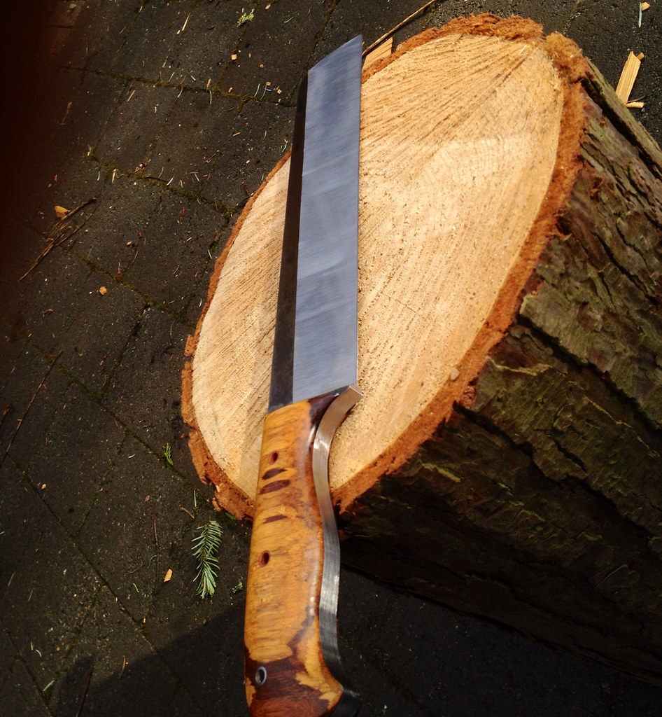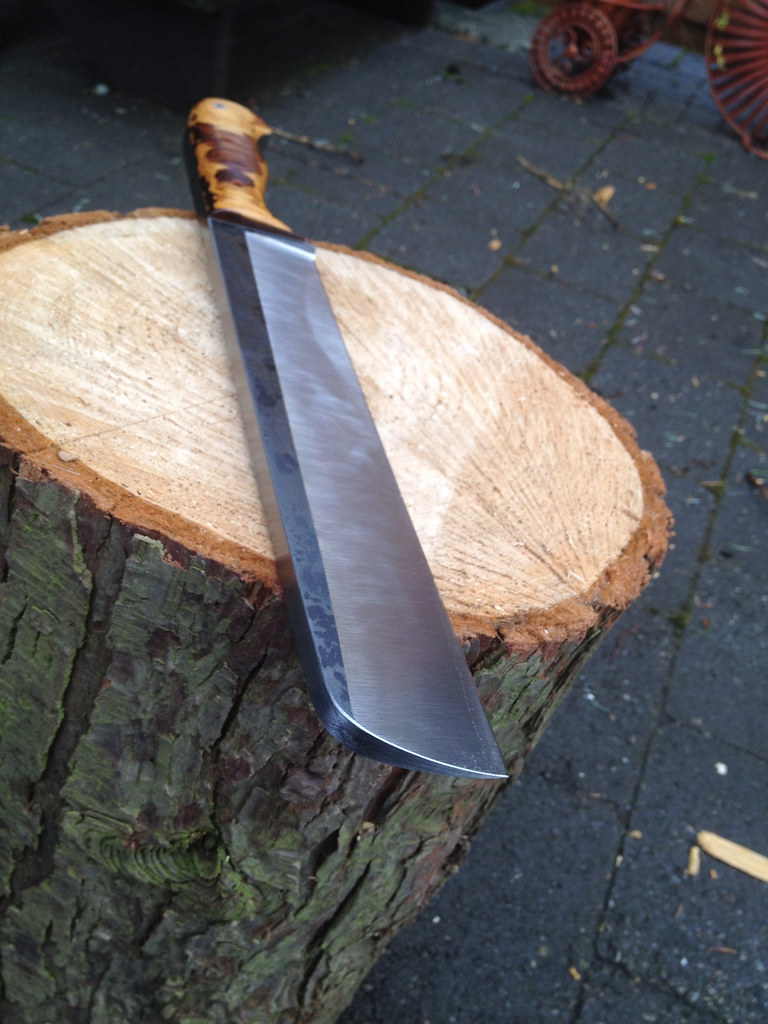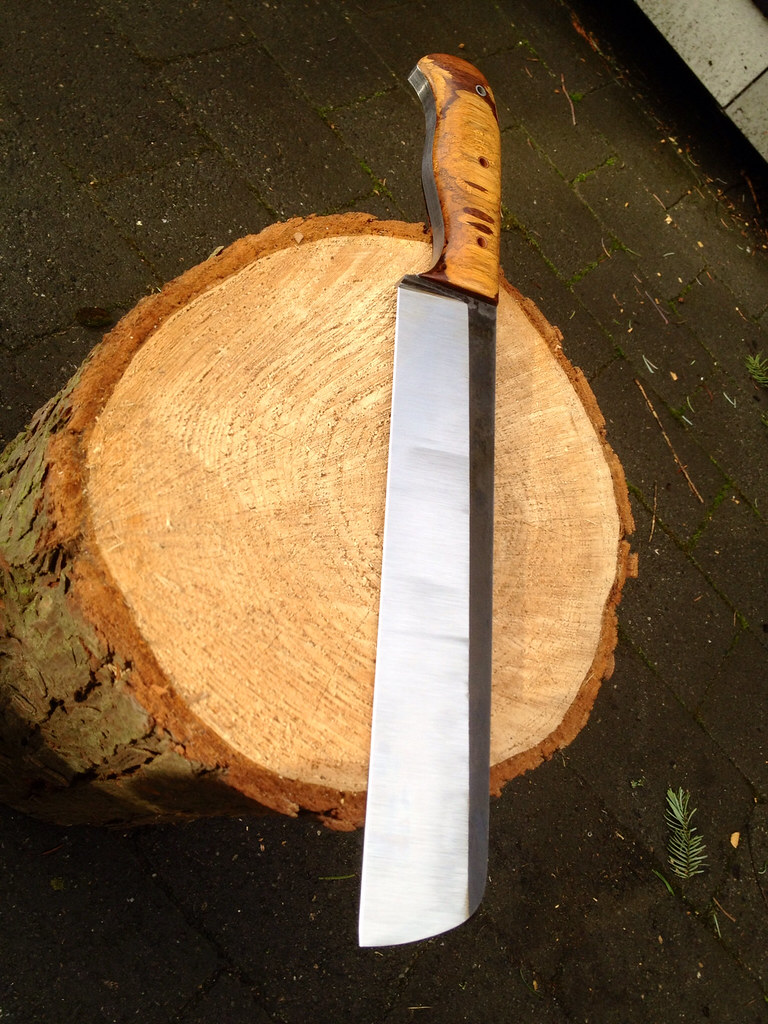 This blade is made of 80CRV2 carbon steel:OAL 16.5" ,2"high ,0.400" thick with 11" blade length. The blade weighs 38 OZ's. It has a bamboo handle with two micarta and one stainless lanyard tube.