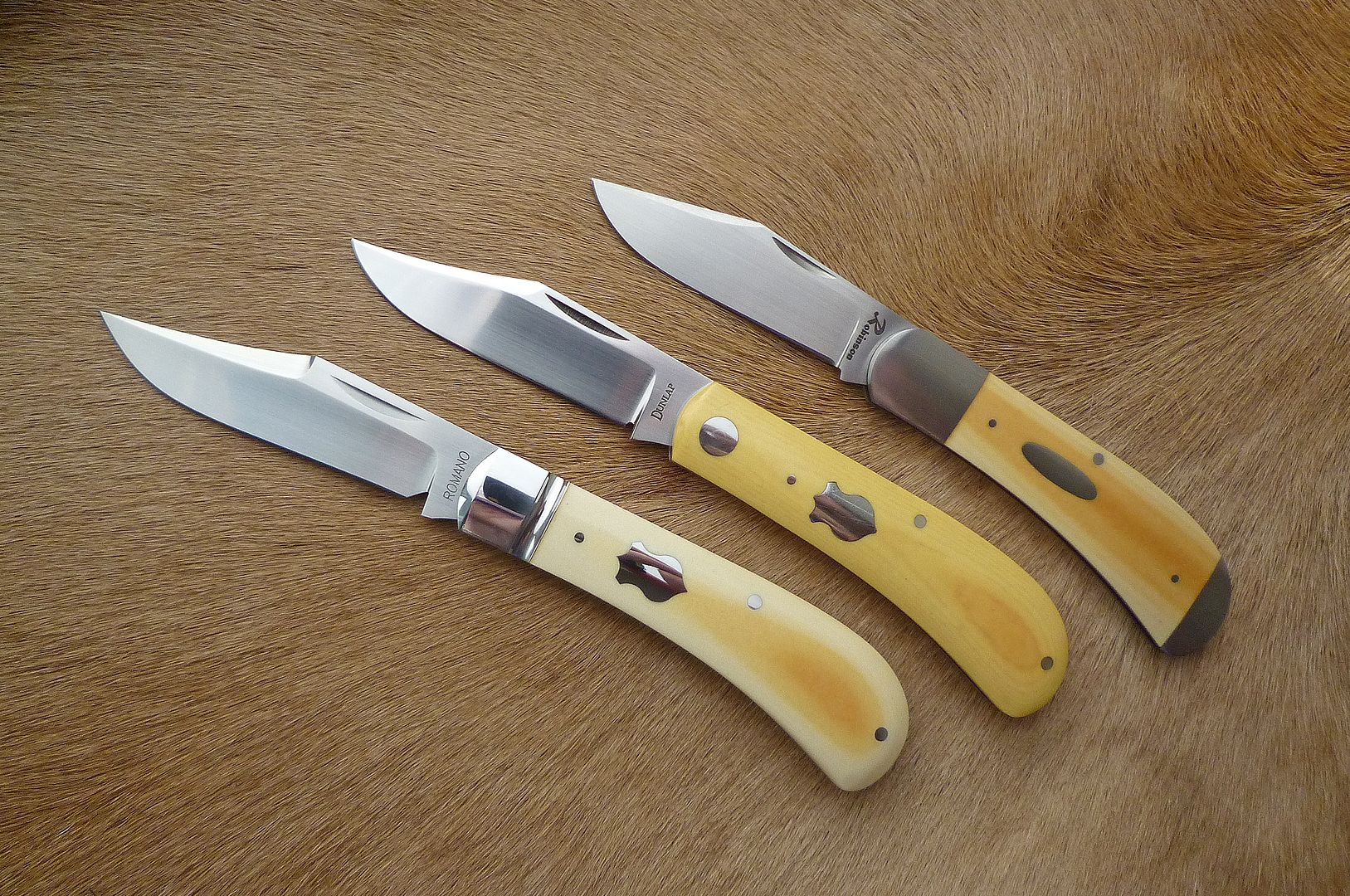 Here's a Rough Ryder sheep/lamb double lockback with red micarta covers and a nice (but bulky) belt sheath that I bought in December: Closer view of knife without sheath: A view of back springs and release bars for the blade locks: - GT