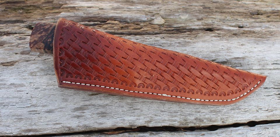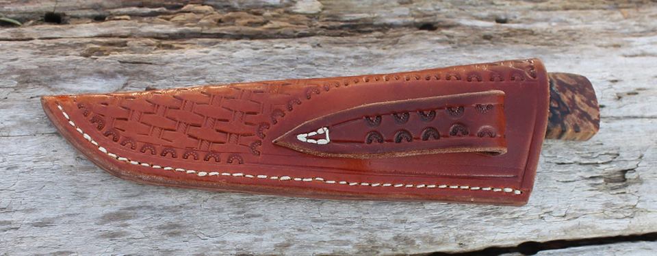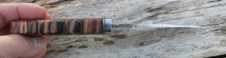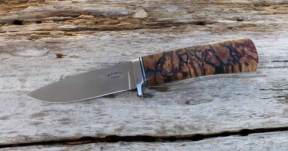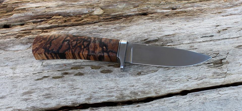 Drop point hunter with stabilized hackberry. 1/8" 154 CM ss,jimped spine,hollow ground. 416 ss guard. 8" OAL; with 3-3/4" blade,3-1/2" cutting edge . Nice light weight knife feels great in your hand . RH vertical belt loop sheath by Mike. $sold, shipped, Paypal goods, I'll eat fees, USA only.