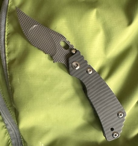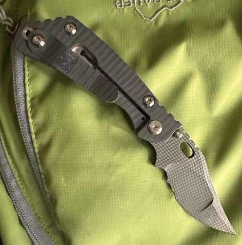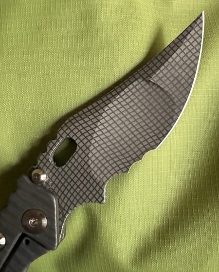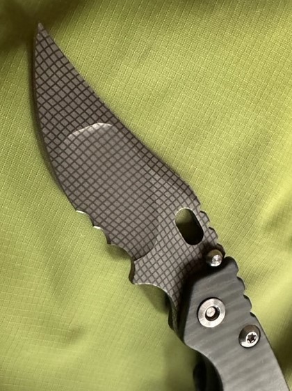 Mick Strider Custom PerT with a night grid pattern on the blade; super smooth action, early and solid lock-up, no blade play, with a centered, sharp blade. I carried it once; it is mint shape other than one faint line on the pocket clip. Here are quick pics: