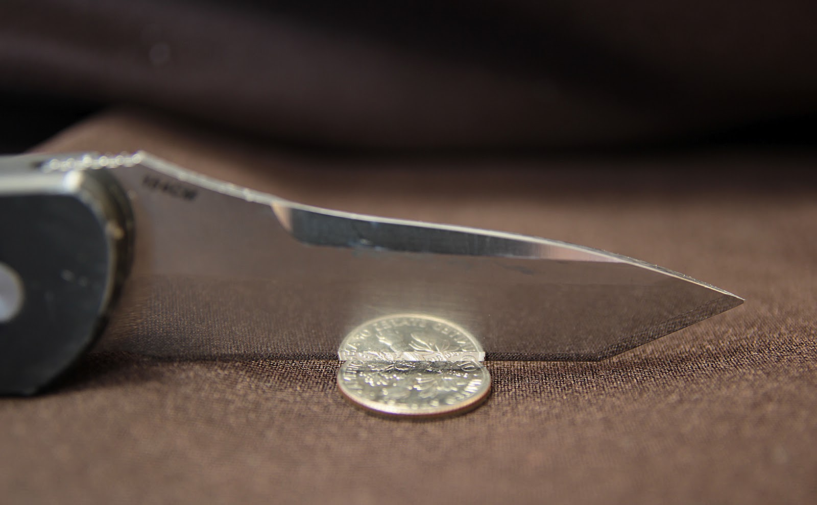 Here is the Benchmade 9500 Mini Stryker from a regular camera after applying first the convex bevel (16°-20° per side), then the micro-bevel (20° per side):