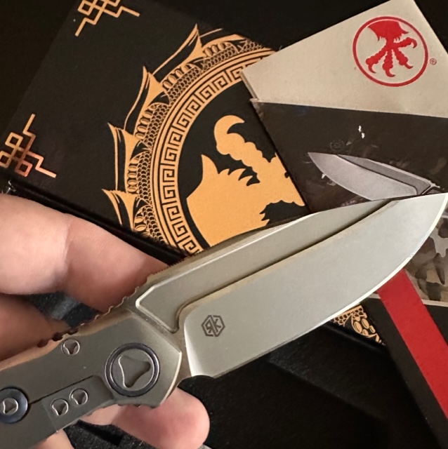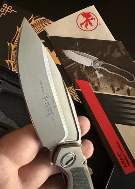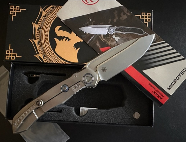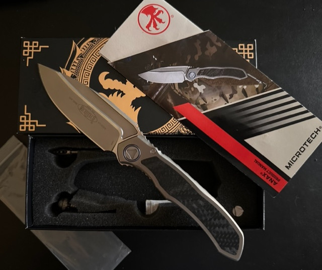 Microtech Ajax with titanium handle with a carbon fiber inlay; comes with its entire packaging (box, landyard thingies, screws, card, etc.). I have recently bought it from another BF member but it is too large for me to carry. It appears to be unused; I have never used or carried it myself.