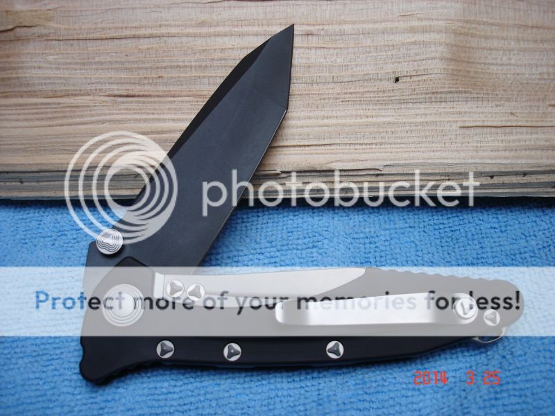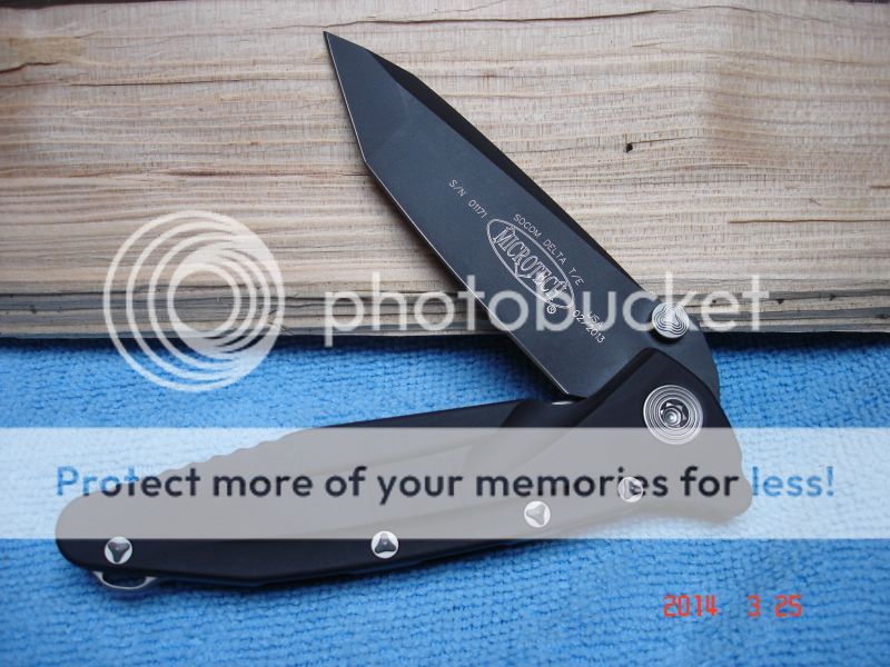 This is a brand new black Microtech Socom Delta T/E with a black tanto blade made of Crucibles powder CPM D2 steel. Never used, just examined. Comes with bag and box. The blade is not quite perfectly centered, and there is a tiny chip on the tip of the blade. Photos clearly show both issues, which are how the knife came. The factory edge is very sharp. The birth date is February 2013. Good fit and finish and operation.