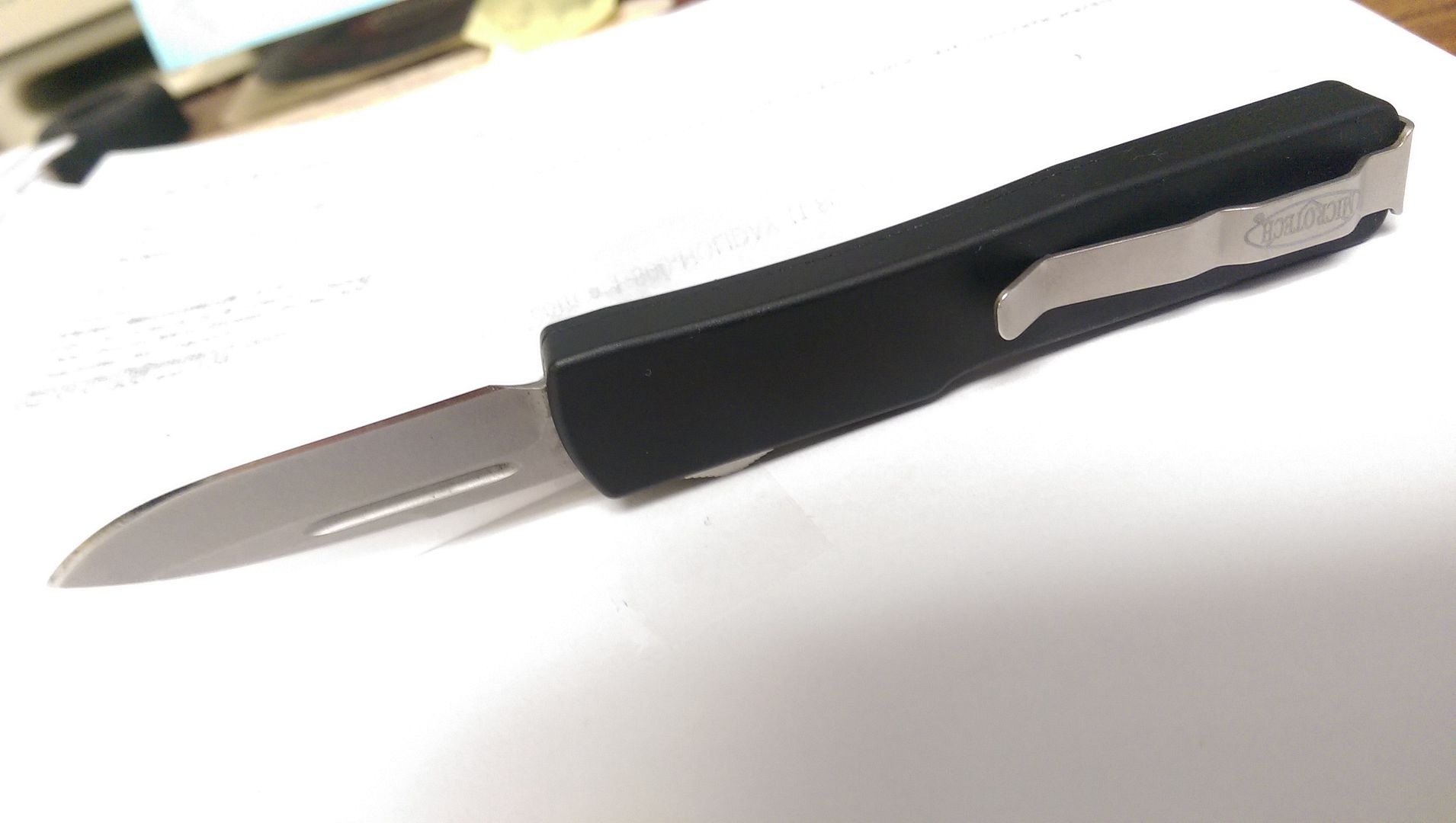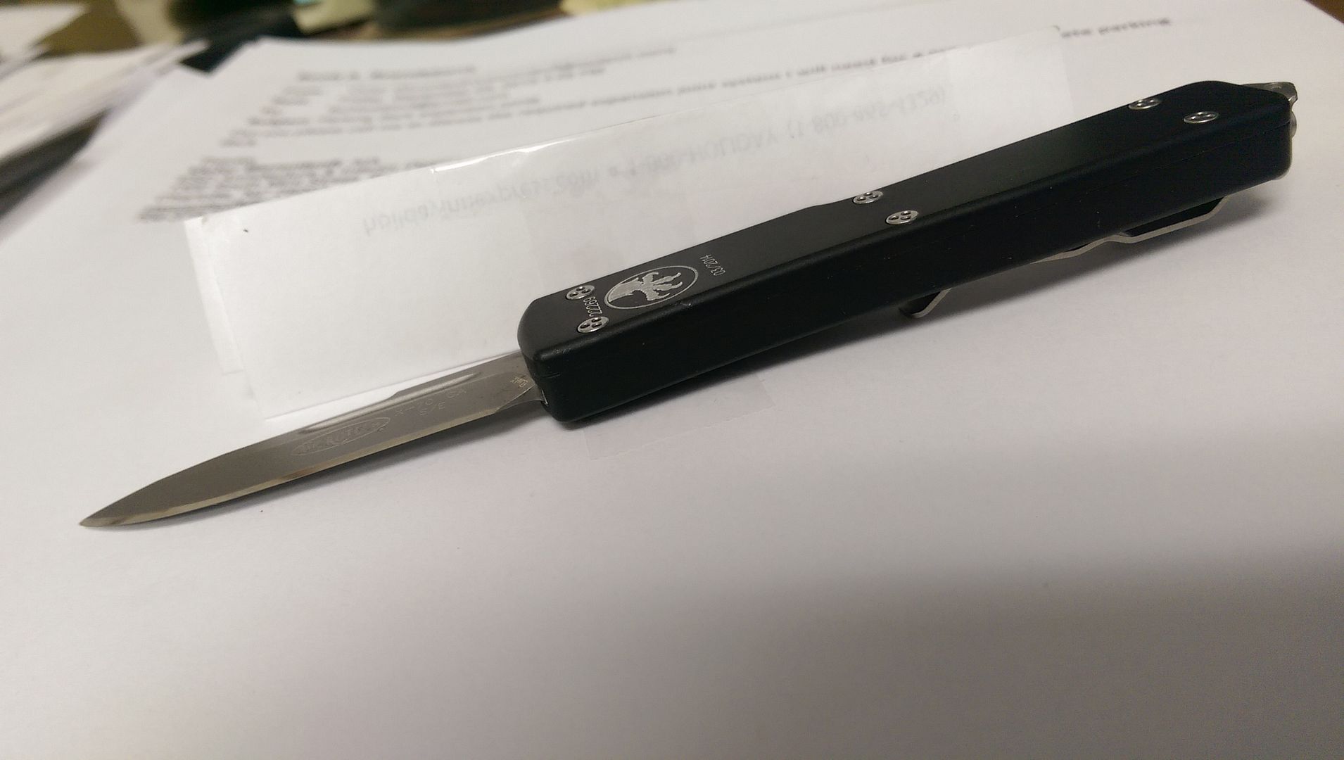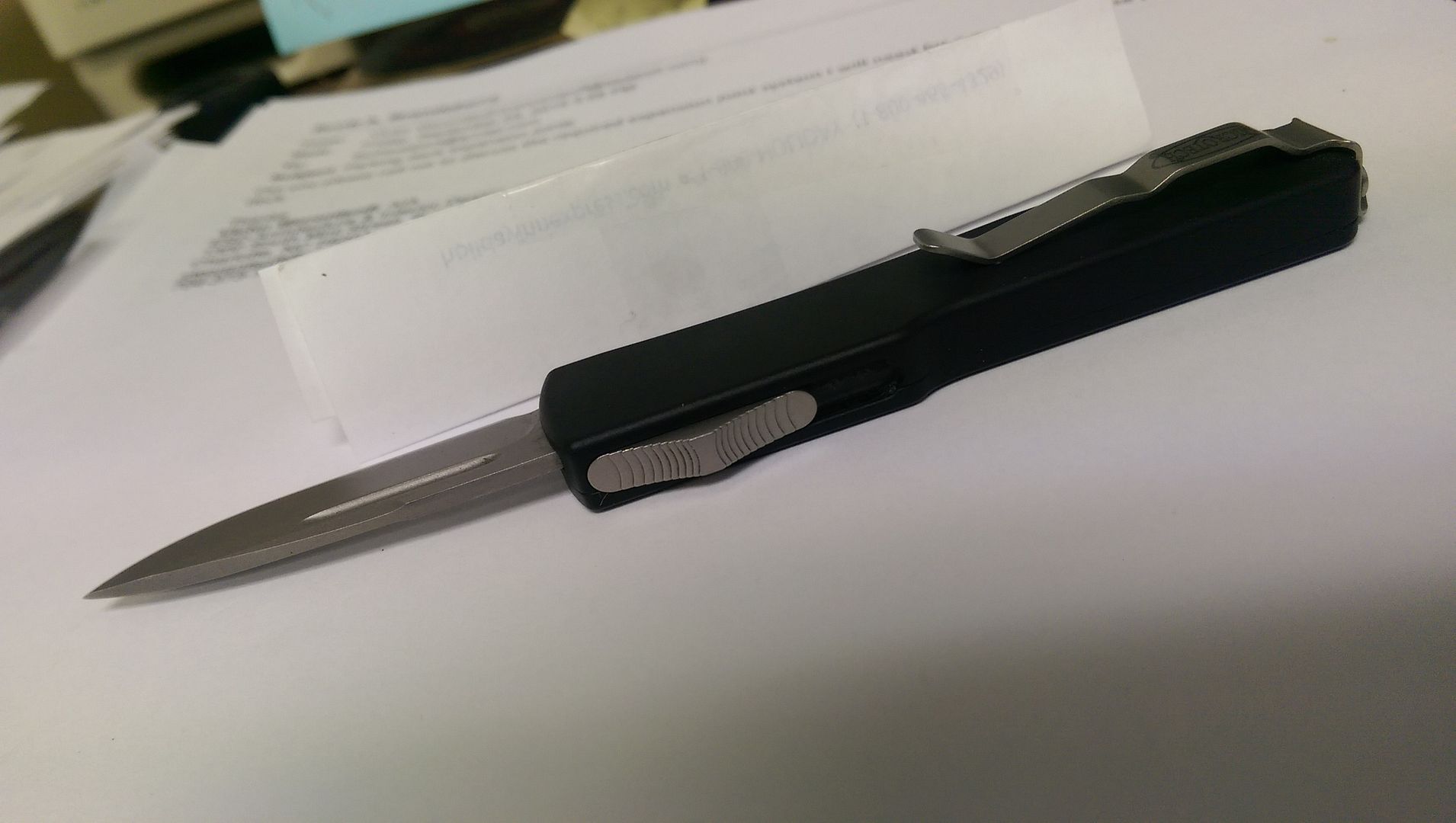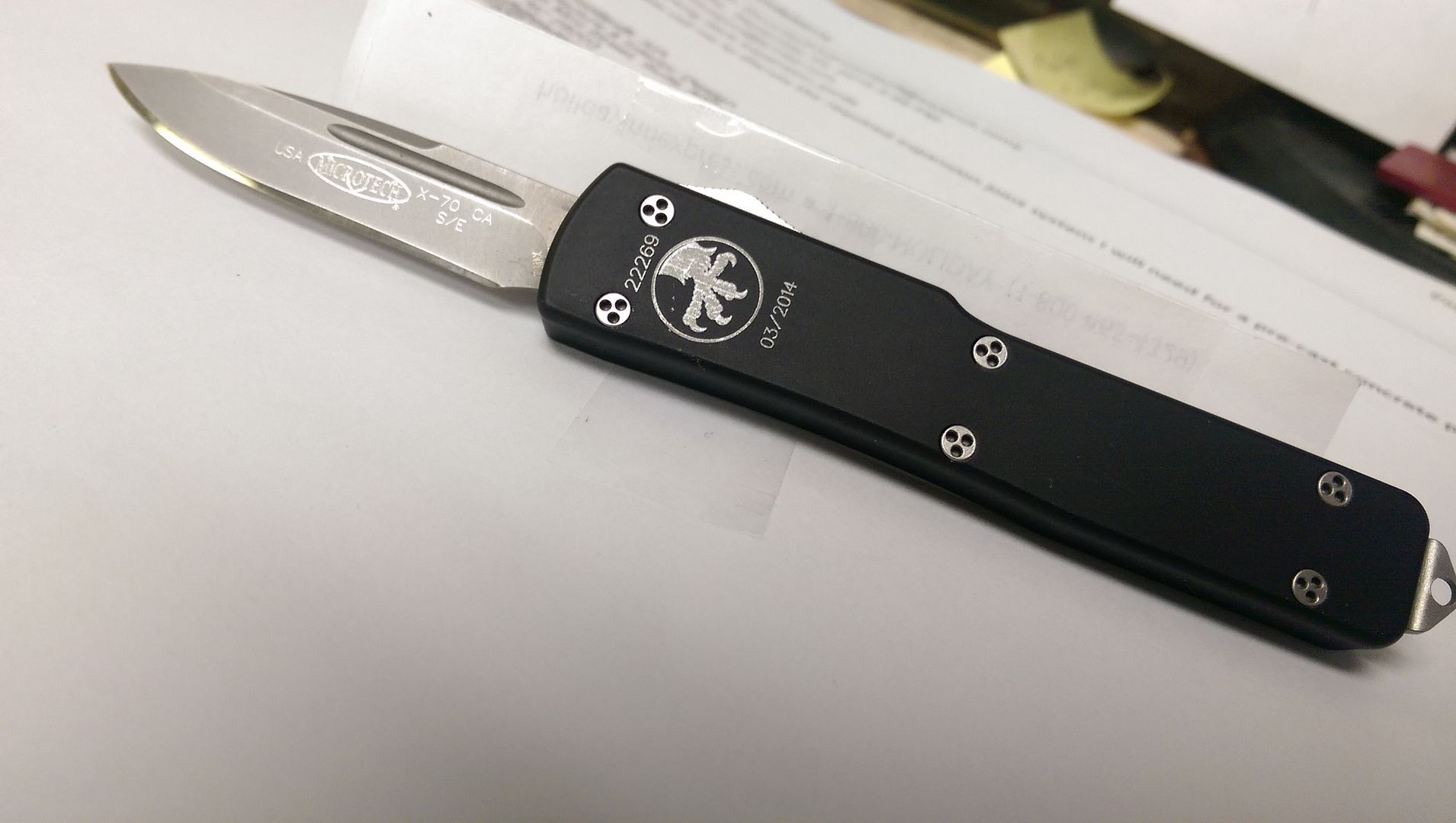 I just have too many knives on my "want list" and too few funds, so I am offering up my light user UTX-70 CA SE. No marks that I have been able to find, with the only exception being under the slider switch from operation (and even that is light); any specks in the pictures would be dust. The most strenuous action that this one has seen is loose threads and envelopes (sorry, no batoning firewood or skinning big game with this one, lol!). I put a near-polished Wicked Edge on the Elmax blade steel. The handle is marked 22269 and 03/2014. I am the second owner. I can't remember if I have a box for it, but if I do, it will be included (I always keep knife boxes stored in a plastic tote, so if it came with one from the original owner, I have it, but I can't remember off-hand).