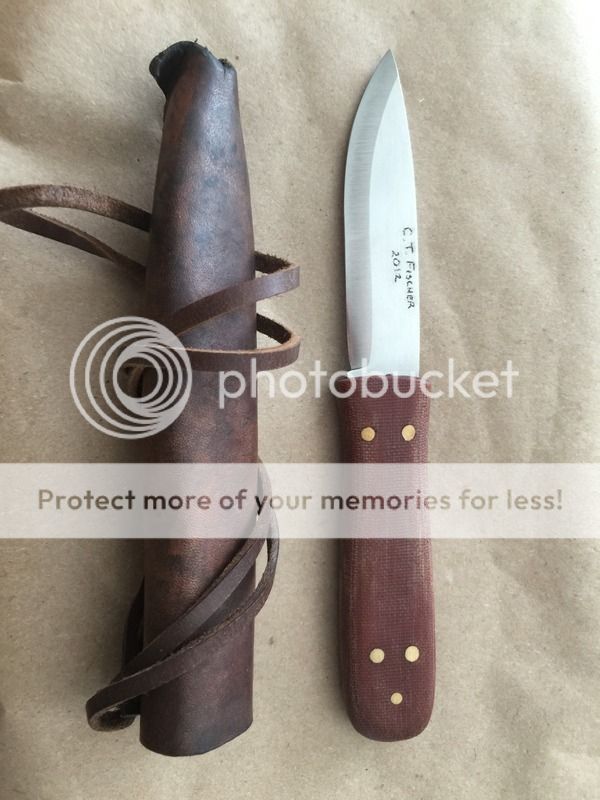 CT Fischer Scandi style necker. Saw blade steel, framed tang with micarta handle, snug leather sheath, blade is 4". Unused. $65 shipped in the US