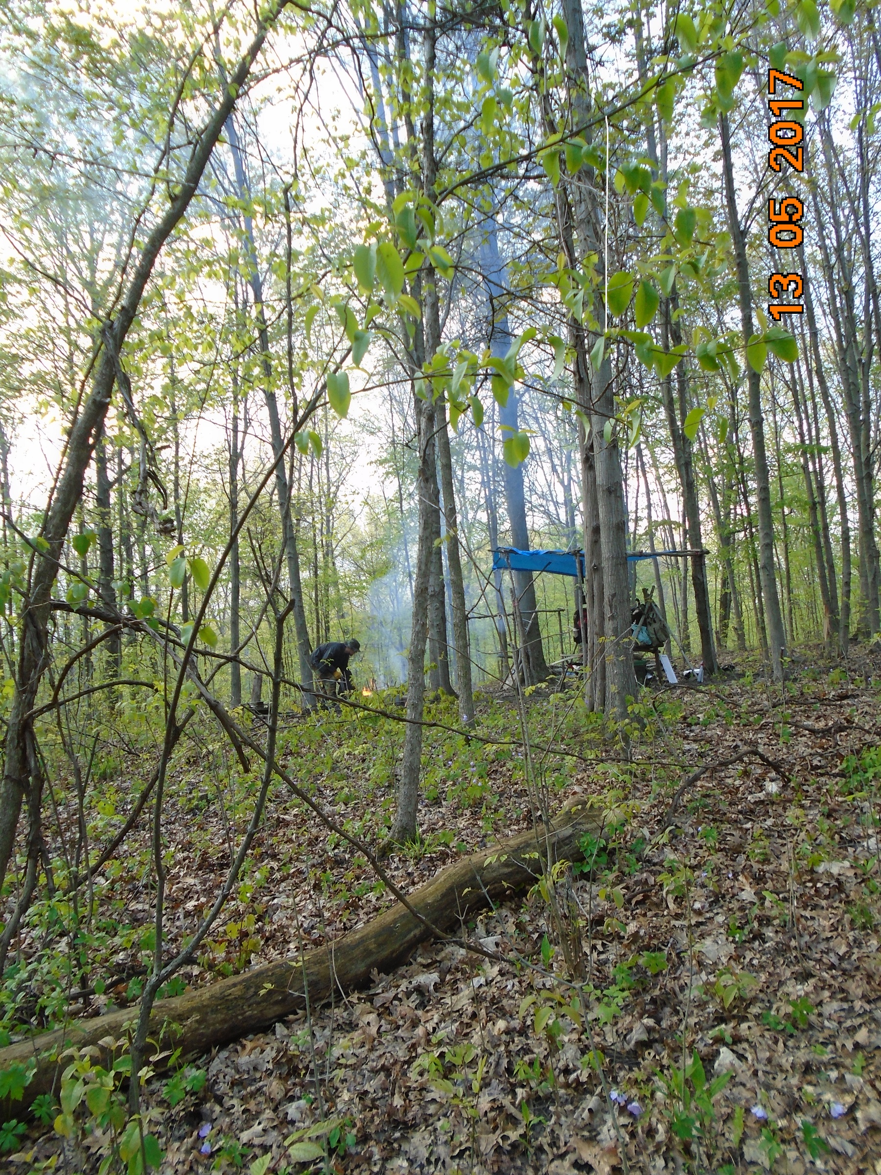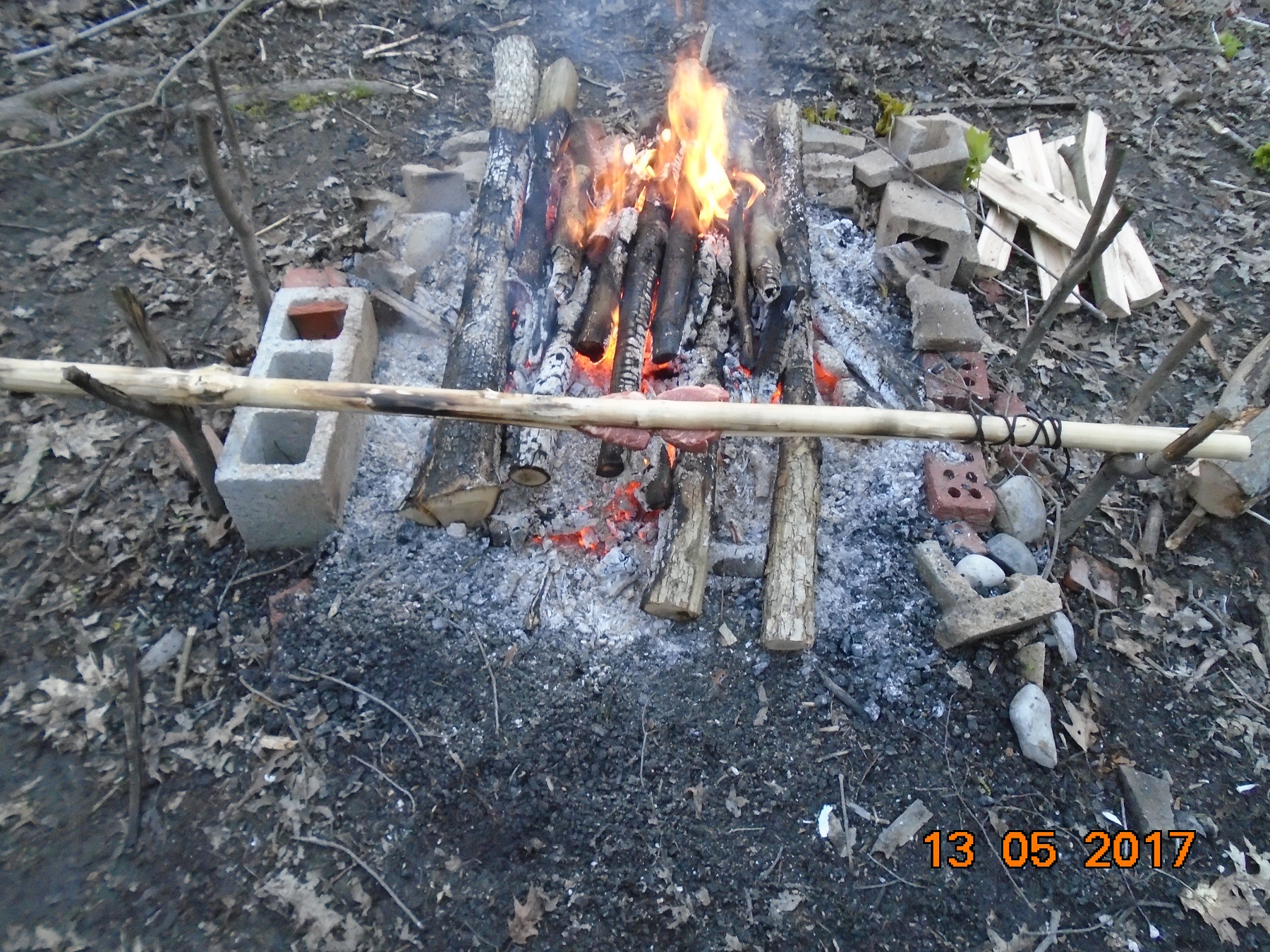Once at the site, we found the fire-pit full from previous use by others who had been there. They also seemed to have drunkenly fallen into the shelter supports, throwing it all off.