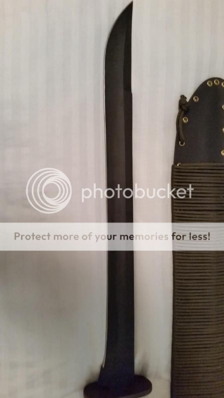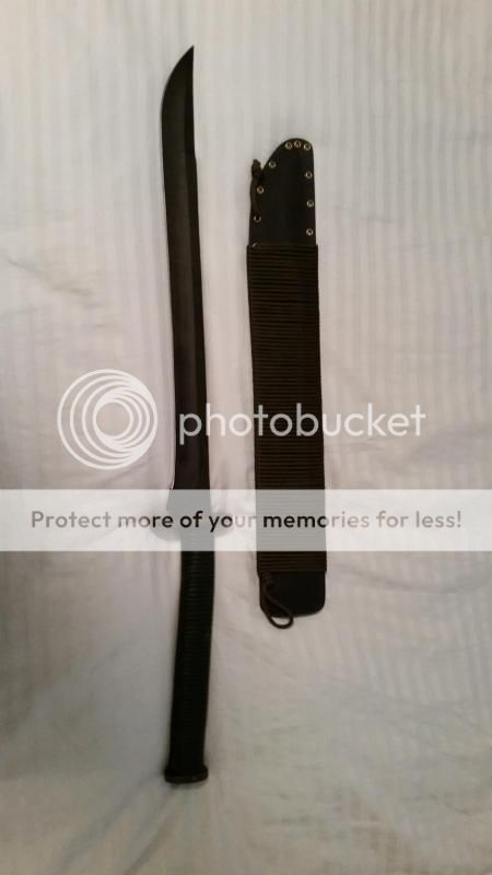 Custom sword from Mineral Mountain Hatchet Works. Bought it 4 months ago and it has never been used. Overall length- 29.5 ". Cutting Edge- 18 ". Blade width- 2" (at widest) . Steel thickness- 1/4" (5160). Weight- 3 lbs. Differentially heat treated. Dark green resin soaked cord handle. Steel tsuba and butt plate. Parkerized blade. Sorry about the crappy pics, I was in a rush and all I have is my phone. Bought it for $650 asking $500 shipped.