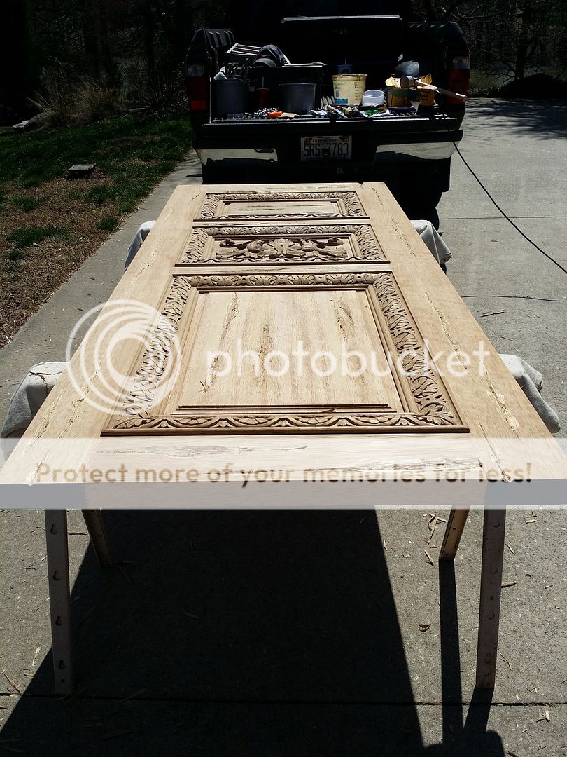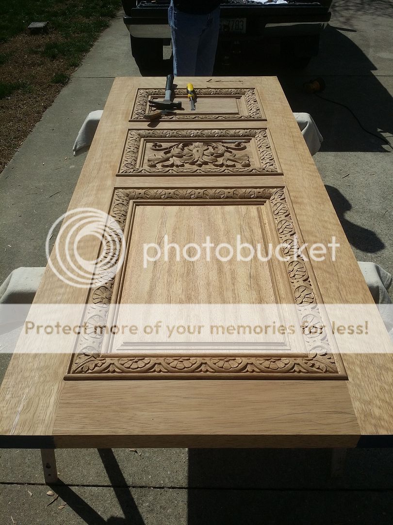 Here is the start of this hand carved door. The curly Brazilian mahogany is some stout wood with a very tight grain structure, this door weighs 87 lbs.