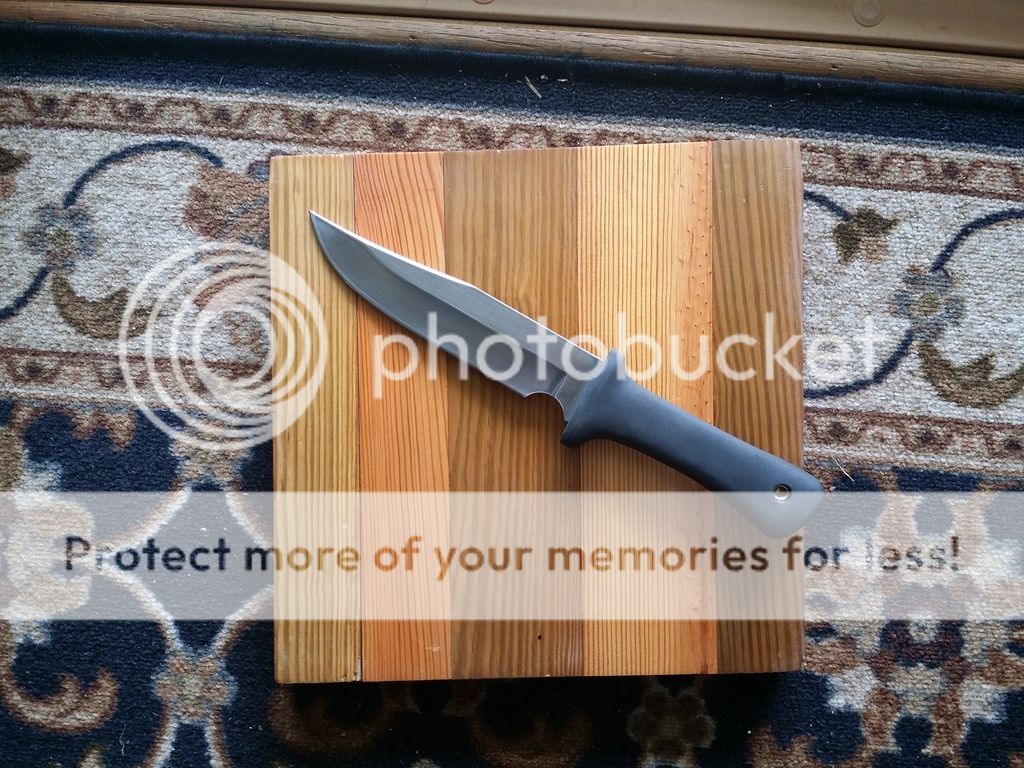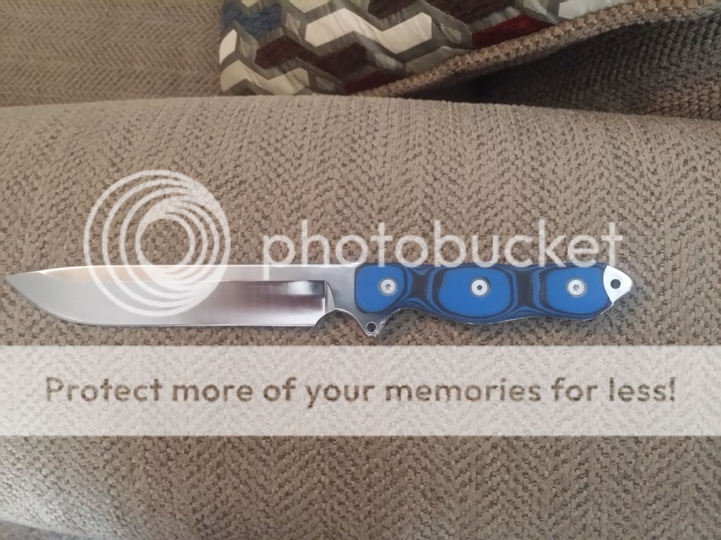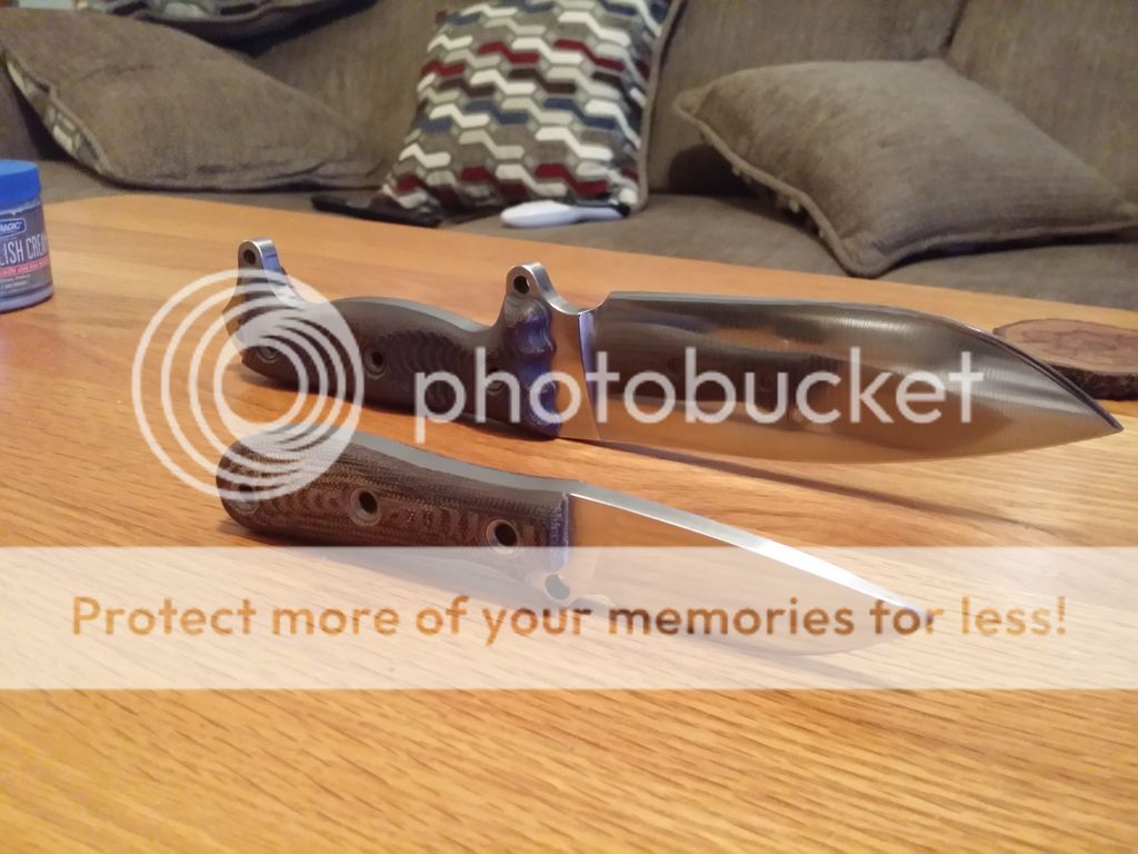 Then on the top of the handle towards the ricasso, there is a sort of hump there, that on the old SHBMs is a small dip. So I ground a little bit out there to mimic the feel of the old SHBM better. After making new scales out of black canvas micarta, I installed them using some copper tube.