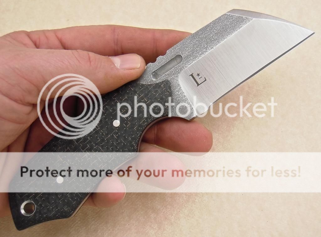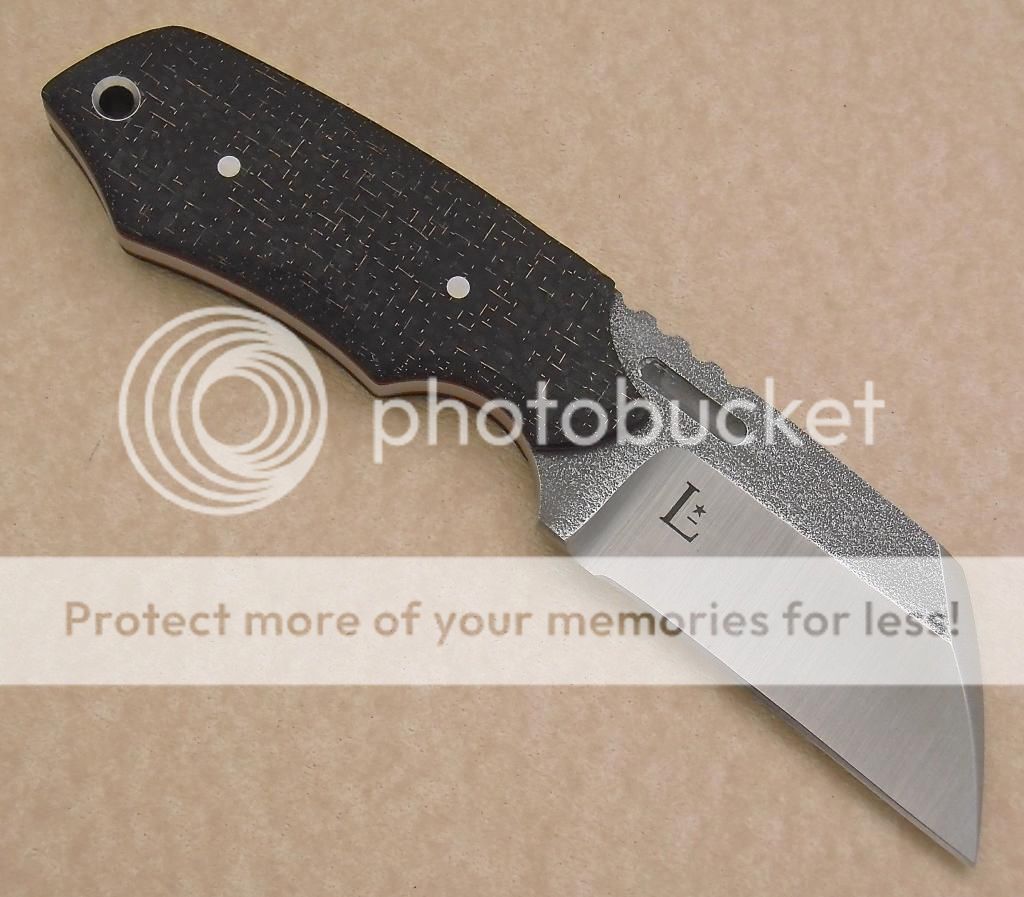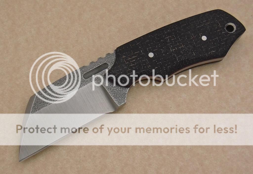 I have finished up this sweet little piece. .180 CPM S35VN with Lighting Strike Carbon Fiber and vulcanized red liners. 6 3/4" overall Length with a 2 1/2" cutting edge. The bevels are machine satin while the flats are right from the mill, the contrast is really cool. I also put a little milling, stainless pins and tubing. $275.00 includes a kydex sheath, that will accept a large teklok, and shipping in the lower US.