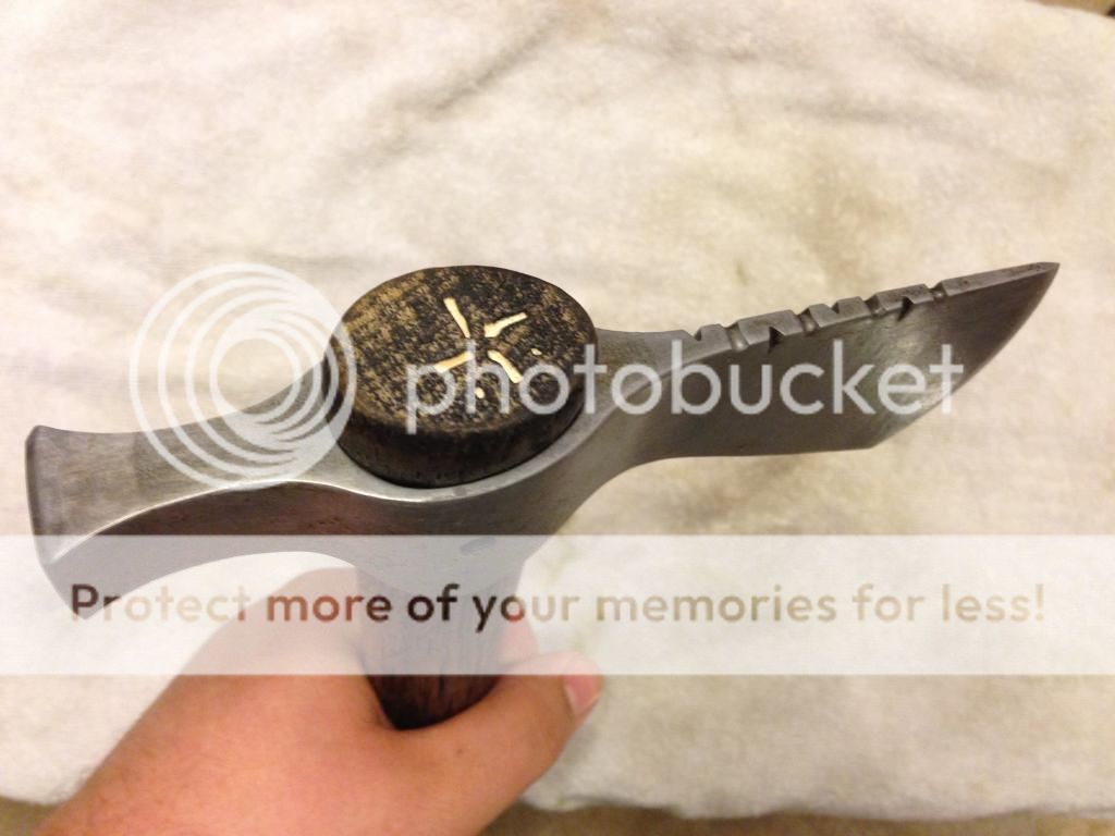 I used a piece of the handle I had cut off the bottom to get the radius, then scribed around the coin with an xacto knife. I used small wood carving bit in my dremel to cut out the inlay. You have to go slow with a lot of test fitting to make sure you get it to fit as tight as possible. The coin is epoxied into the hole and I used a trick I picked up from watching inlaying videos on Youtube where you take sawdust from the wood you are working with and fill in any gaps. Then, put a drop of CA glue on it so it will soak in and bond it. When it dries and is sanded, it pretty much makes any gaps around the inlay disappear.