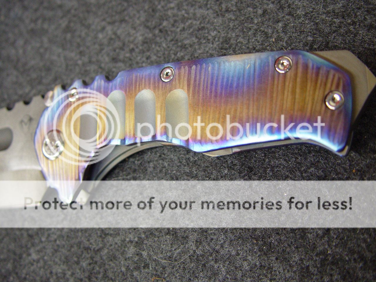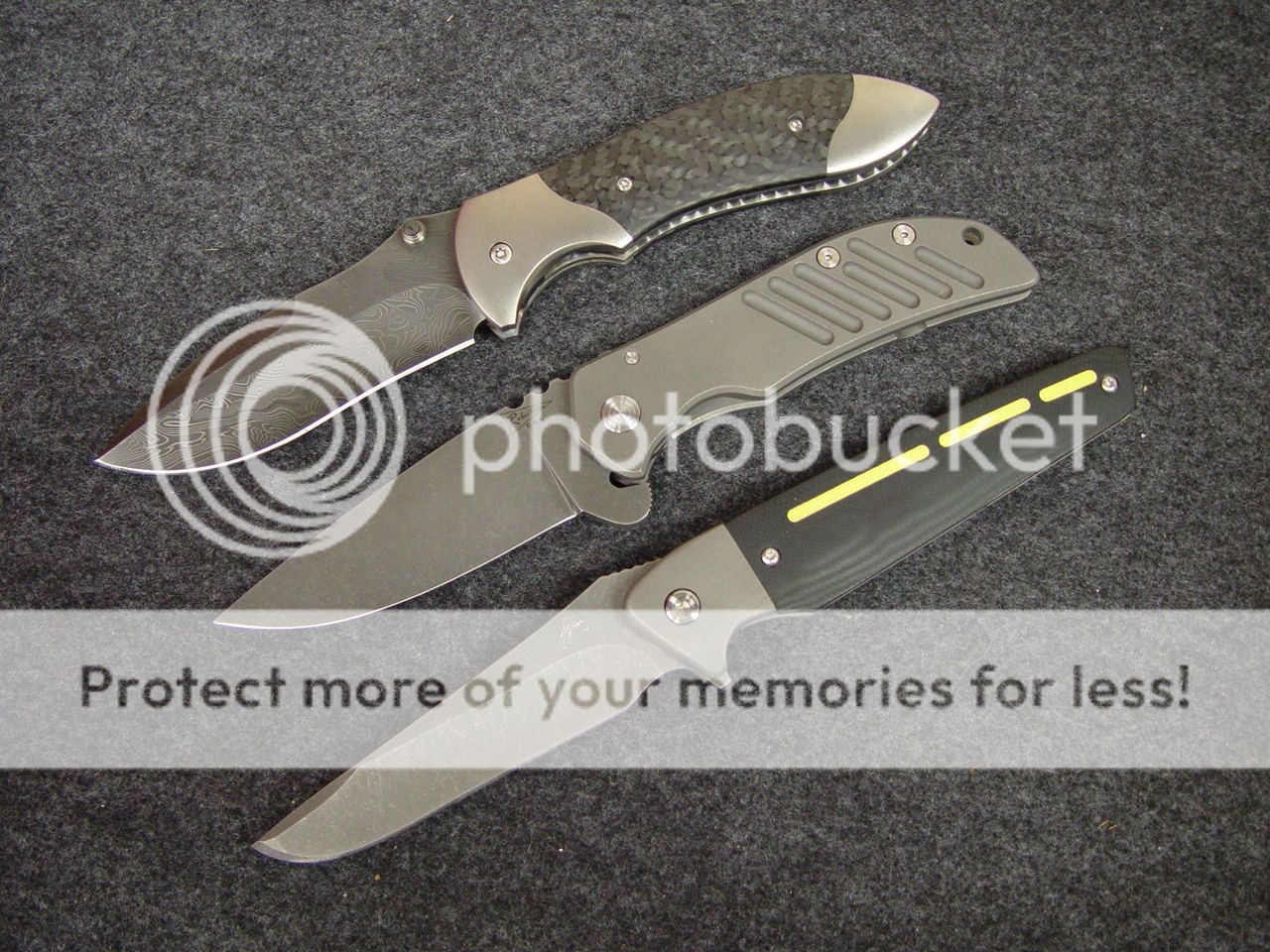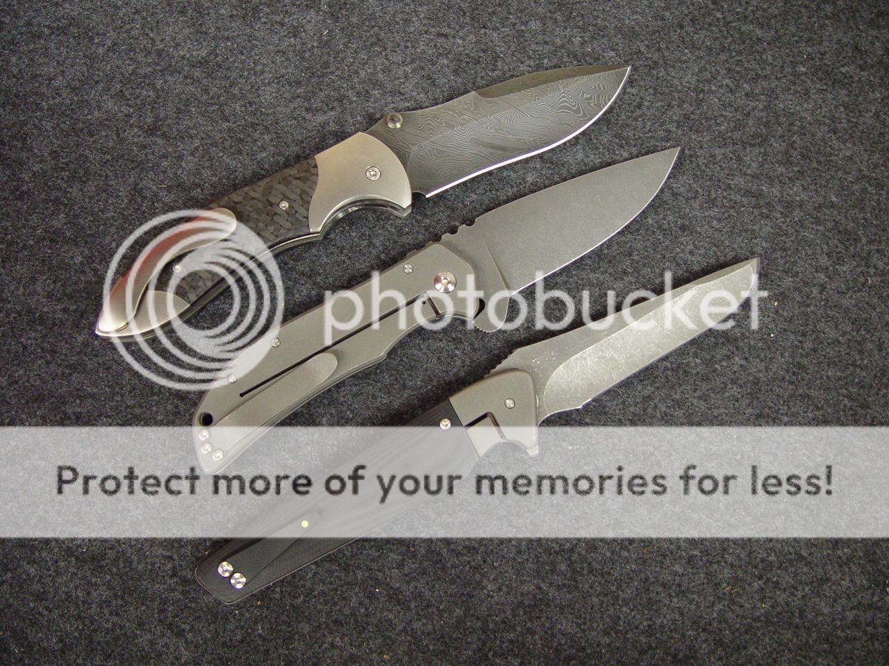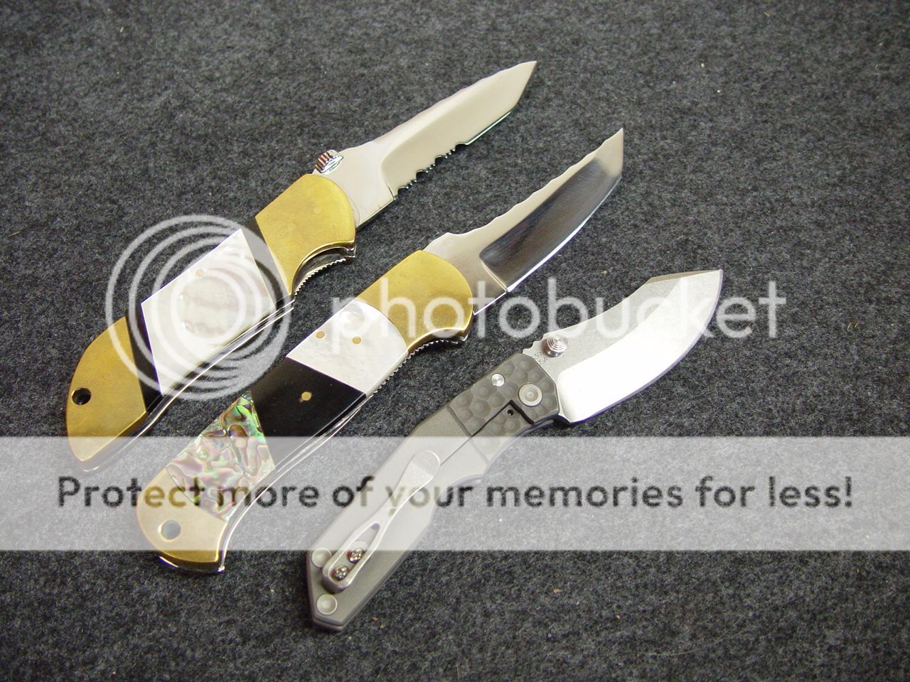 They both have D2 blades, stainless steel frames and liner locks, brass bolsters, and Fred's hand-done rope file work on the blade spines and back spacers. The brass bolsters on both have slight swirls from storage.