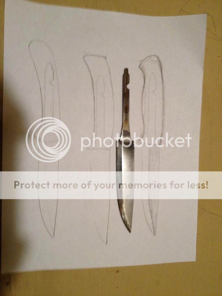 So, after my hand slipped on my Mora HD and I sliced my finger open, I decided it was time to replace the handle. I've drawn up a few designs to get an idea of the general shape. And I believe that I'm going to do this with some chestnut I got about a year ago. And also, I've included a picture of the blade along with my handle ideas for those of you who are curious about the tang shape and length.