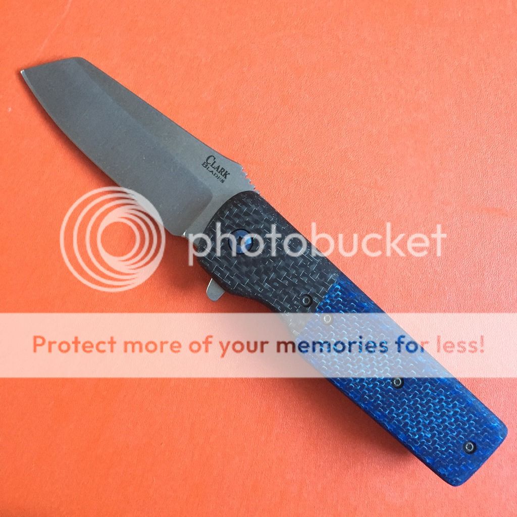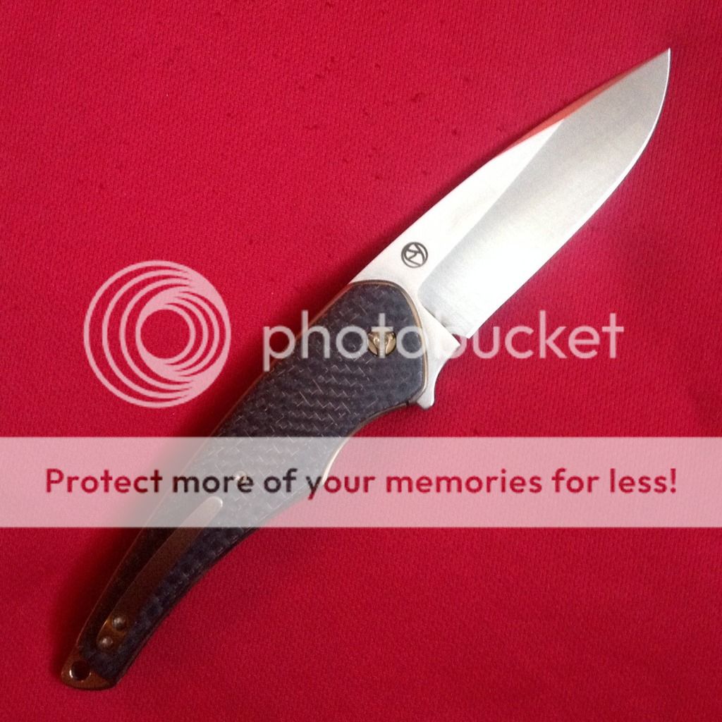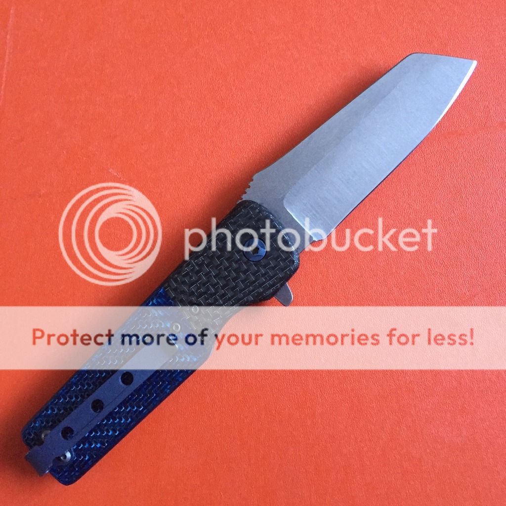 As i am sure you can see I am huge fan of David's work, this is a modified version of his Grunt Folder with an AWESOME Sheepsfoot blade, Blue CF scales with silver LSCF Bolsters. Blade flats are stonewashed while the grinds are vertical satin - perfectly anodized Ti liners as well.