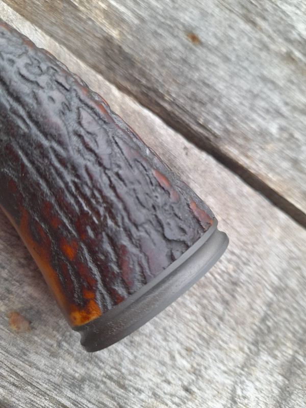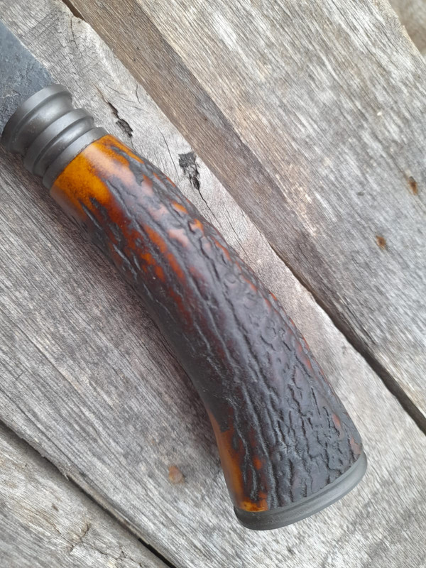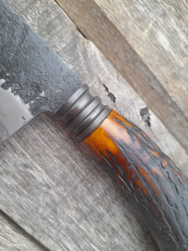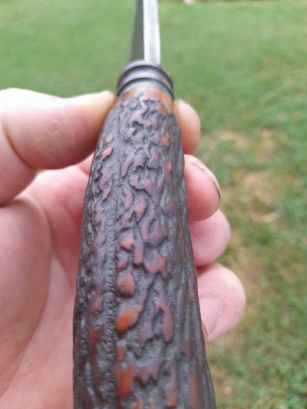An iron button and knob were made, which are worked with a file, then polished to #1000 and phosphated, the end is deer antler.