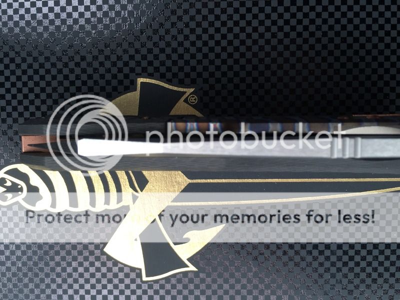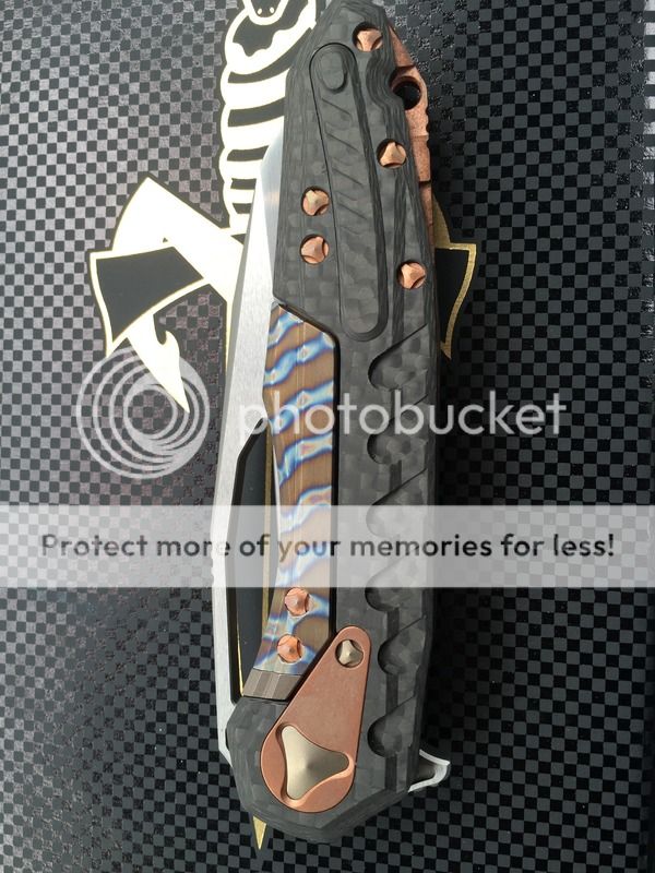 Features a satin finish Cowery blade and Carbon Fiber handle with Copper hardware. This custom knife also features an anodized titanium exotic flame lockbar and a carbon fiber retractable Tip-up pocket clip. Comes with its original box, certificate of authenticity signed by both Anthony Marfione and Deryk Munroe, Marfione nylon pouch, and a copper Marfione dagger.