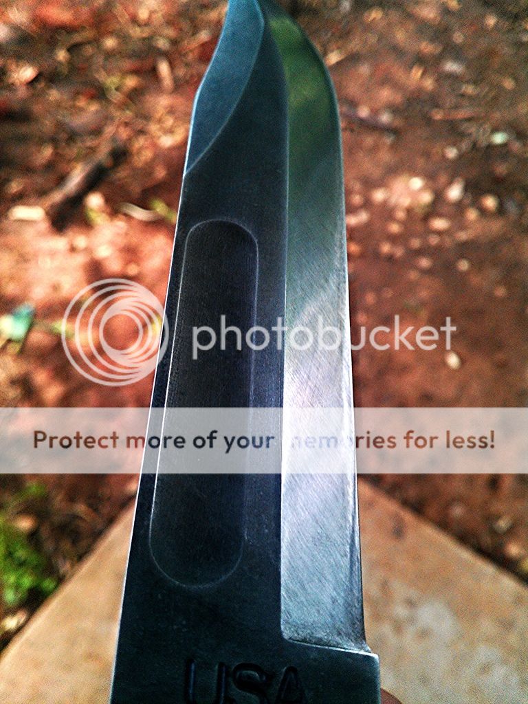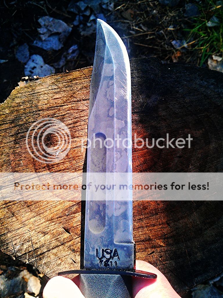 When I first received the blade it was used, beat up, dull, and rusted. Unfortunately I did not get a pic of the knife with the original beat up black coating, and the nickel thick edge. After receiving it though, it went right to the stones, got the edge sorted out, then hit my belt. With about any knife I get I carry it around everywhere for awhile and just use it like my only blade. The coating was toast so I went ahead and let that 1095cv air out with some stripper and then gave it a bit of a acid etch. I think this is the first pic I took of it.