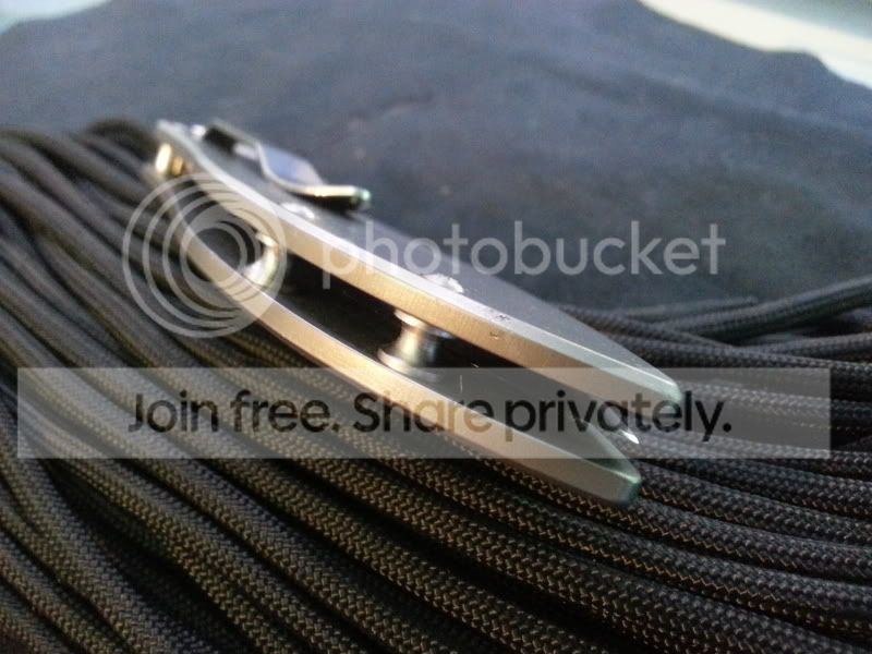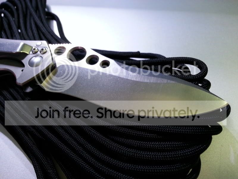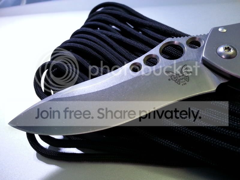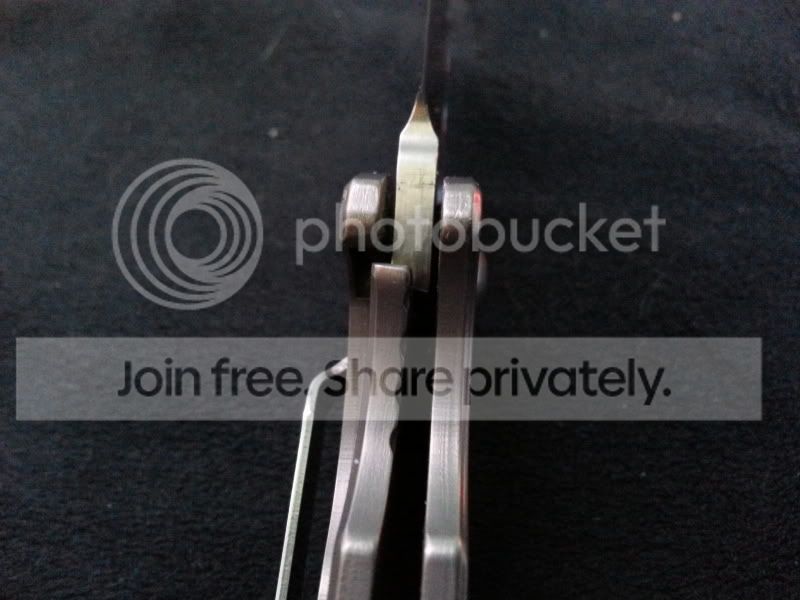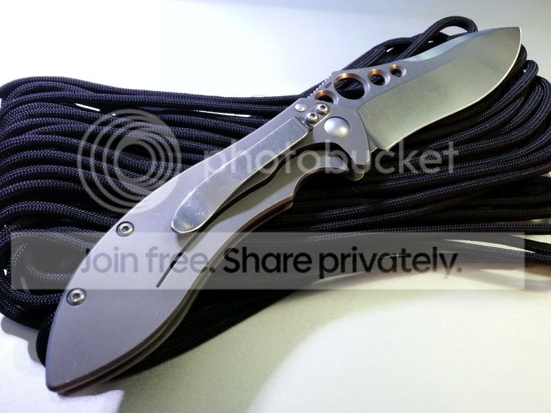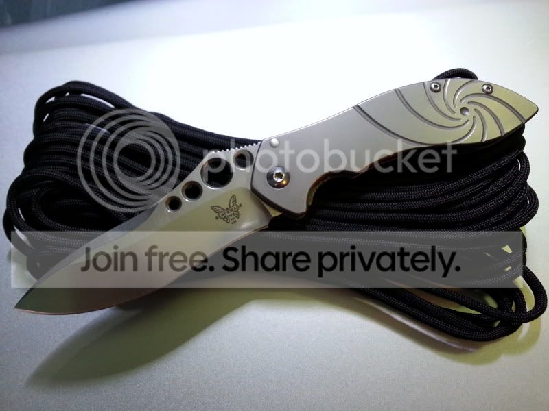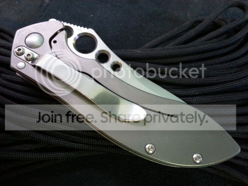I have my Benchmade 625 Mini Skirmish up for trade today. This knife was a user by the previous owner. However, he sent the knife to Benchmade for service and they replaced the blade entirely. So the blade was 100% brand new when he sold the it to me, and I have never used or resharpened it since. Also the Ti handles had light carry marks and "snail-trails" as is common with titanium. But as soon as I got the knife I disassembled it and bead-blasted (fine glass beads) the handles. I re-lubed the knife with Finishline Flouro grease. The result is essentially a brand new knife. But there are a couple very small nicks or dings along the back of the handles, near the standoffs, that bead blasting could not remove. Also the lock is slightly sticky at times. A little graphite on the lockbar helps alleviate that. But other than that it's in perfect condition. It includes the box, papers, and baggy.