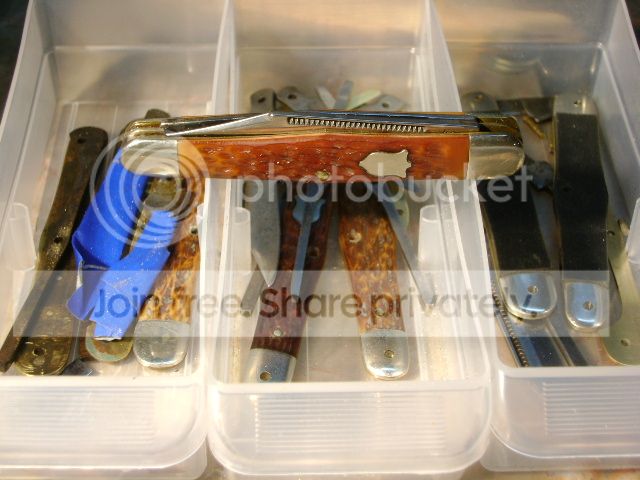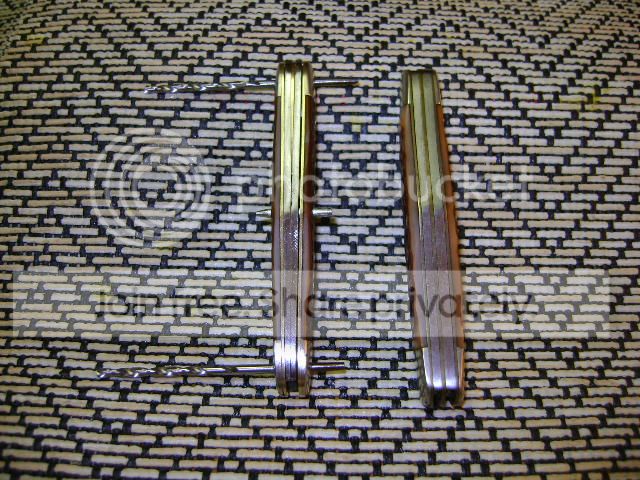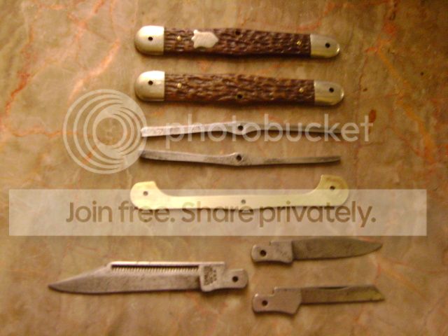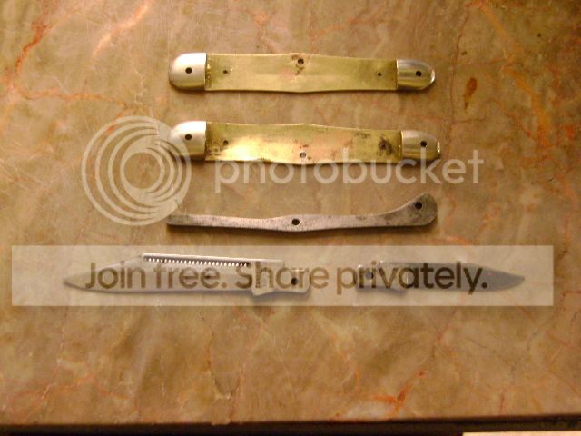 As I sit there, I now have 3 knives in pieces. 7 usable blades, single and double ended springs, a couple of brass center scales, 2 good liners with bolsters attached but no scales and 4 liners with bolsters and Delrin scales. I destroyed all the pins (go figure) but I plan to replace them with 3/32” nickel silver rod anyway.