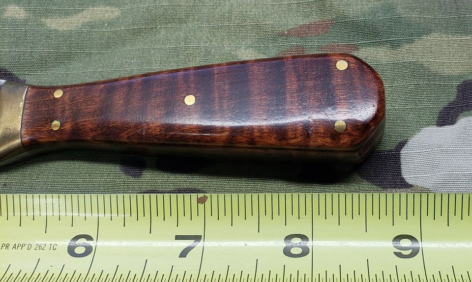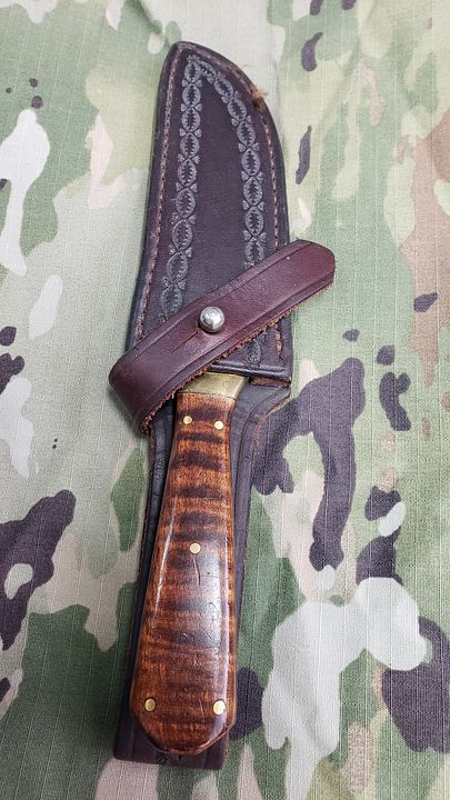 My Dad passed away ten years ago. I found this knife in a tool box of his long after his death. I never knew about it. But I can guess it's from the 50's as he was in the Uranium mining business in that era. He spent a lot of time out in the wilderness around Monticello Utah he probably purchased it some where near Albuquerque NM. The blade was just left rough. Very nice figure to the wood handle. Nice waxed leather sheath. Not a marking to be found on either the knife or sheath, so not a commercially produced knife.